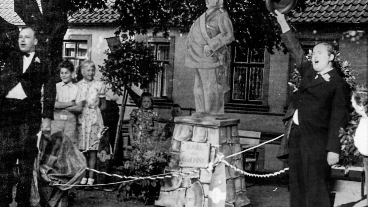 Das Monument „Karl der Große“ zeigte die Figur des etwas klein geratenen Oberst, den die Schützen auf einen hohen Sockel platziert hatten. Zur feierlichen Enthüllung vor einer riesigen Zuschauermenge hielten Ernst Niemann und Gunter Diekmann die Festreden.