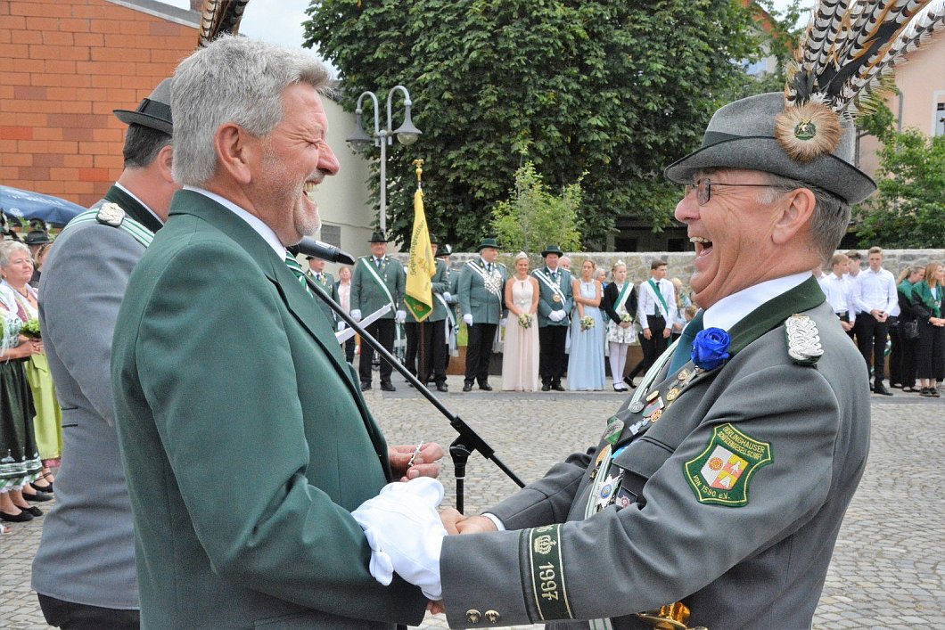 Marius Schmidt hatte beim Königsschießen am Montag den Apfel heruntergeschossen, Nils Hartmann das Zepter und Daniel Schollmeyer die Krone. Entgegen der Vermutung einiger Schützen, dass der Zapfenstreich letztmals vor 30 Jahren im Zelt hatte stattfinden müssen, haben weitere Recherchen ergeben, dass dies im Jahr 2001, im Königsjahr von Horst Steinkühler und Christel Hartmann, der Fall war. „Damals hat es geschüttet, wie aus Eimern.“