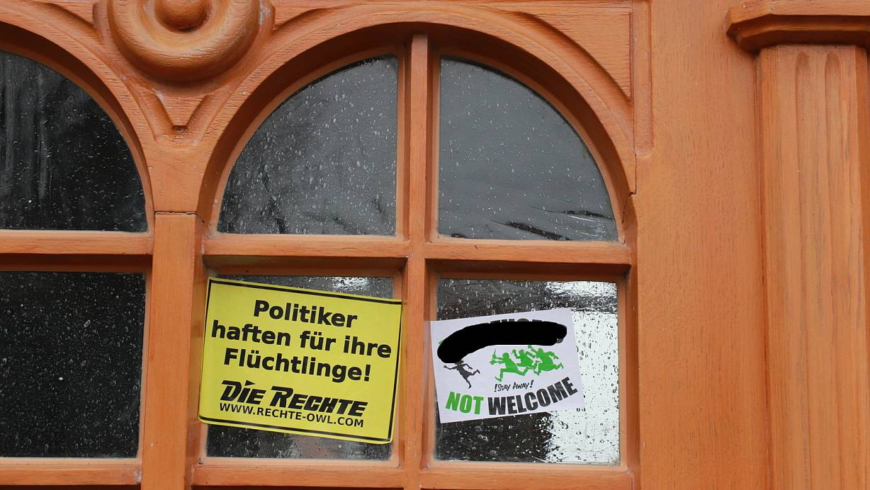 Oerlinghausen. Unangenehm überrascht zeigte sich Bürgermeister Dirk Becker, als er gestern Aufkleber mit rechten Hetzparolen an der Eingangstür des Rathauses vorfand. Die vier gedruckten Aufkleber wenden sich gegen die Aufnahme von geflüchteten Menschen. „Politiker haften für ihre Flüchtlinge!“ lautet einer der Botschaften, die auch als Drohung aufgefasst werden kann. Als verantwortlich zeichnet die Partei „De Rechte“. Ein weiterer Aufkleber unterstellt den Flüchtlingen, Vergewaltiger zu sein. Sie sollten wegbleiben, denn sie seien nicht willkommen, lautet der englische Text. Rund um das Rathaus waren zuletzt immer wieder solche Aufkleber aufgetaucht.