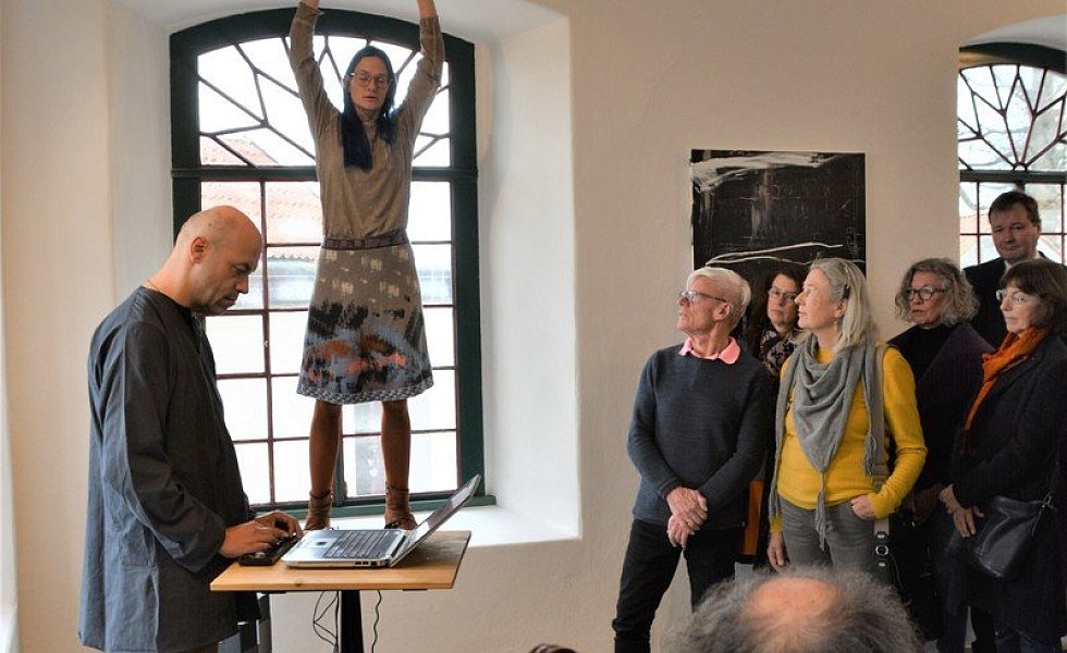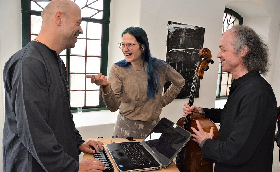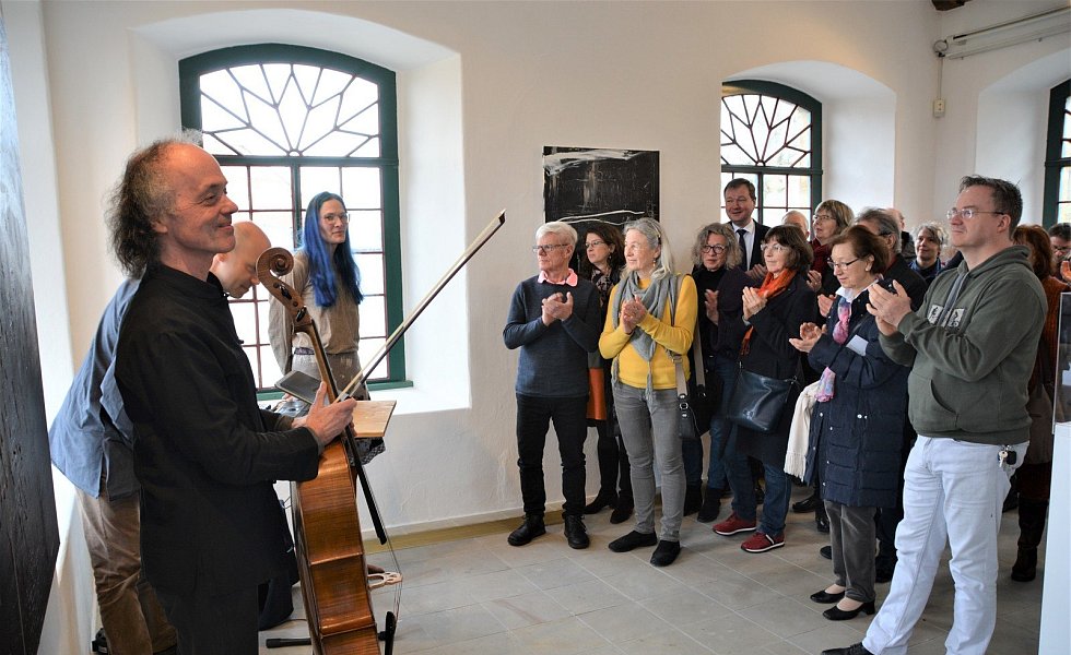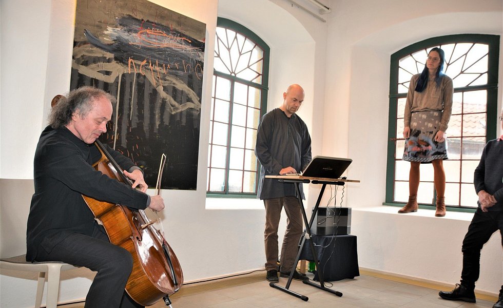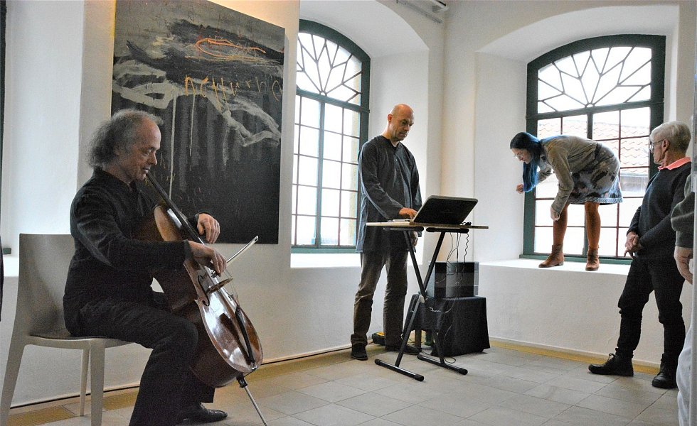 Beaugrand nutzt angesichts der Geschehnisse in den vergangenen Wochen und Tagen die Gelegenheit, einen Appell an die mehr als 60 Besucher zu richten, sich für Frieden und Freiheit einzusetzen, sich Populisten und ewig Gestrigen entgegen zu stellen. Der künstlerische Leiter schlägt dann die Brücke zur Gruppe "Tatuntat" mit Cellist Willem Schulz aus Melle, Anna Bella Eschengerd aus Schloß Holte-Stukenbrock und Marcus Beuter aus Bielefeld. In einer freien Improvisation kleidet das seit dem Jahr 2008 bestehende Trio Umweltgeräusche in ein wirkungsvolles Spiel, dem die Zuschauer aufmerksam folgen.