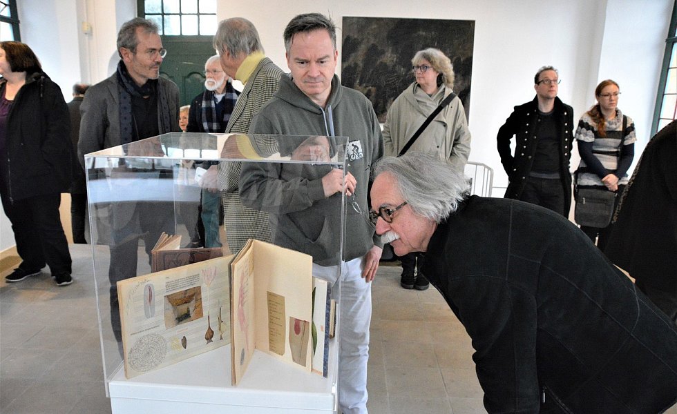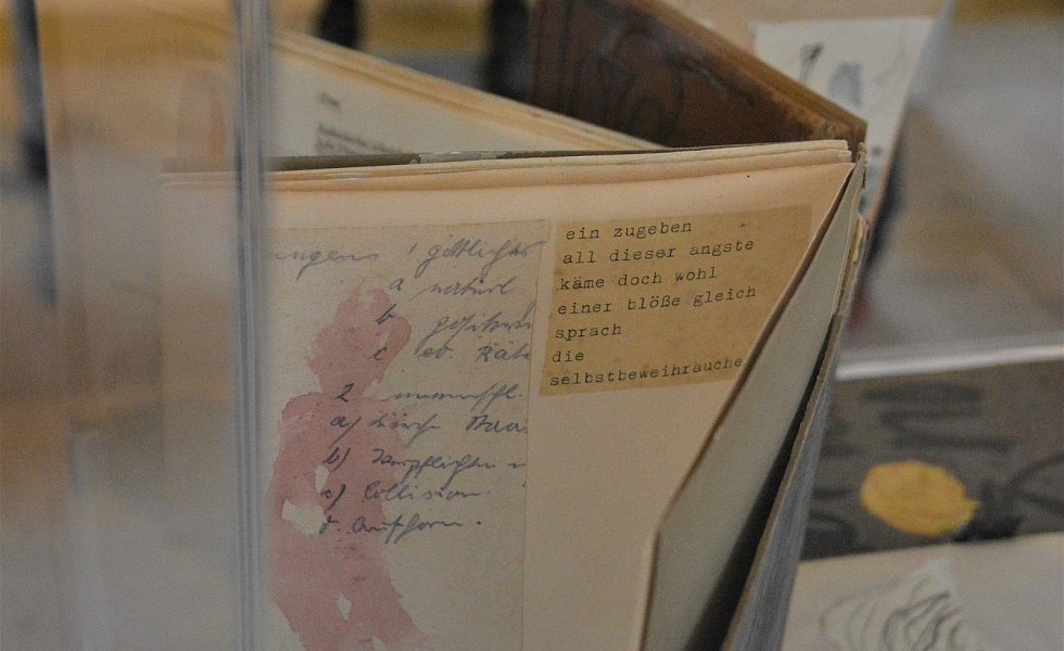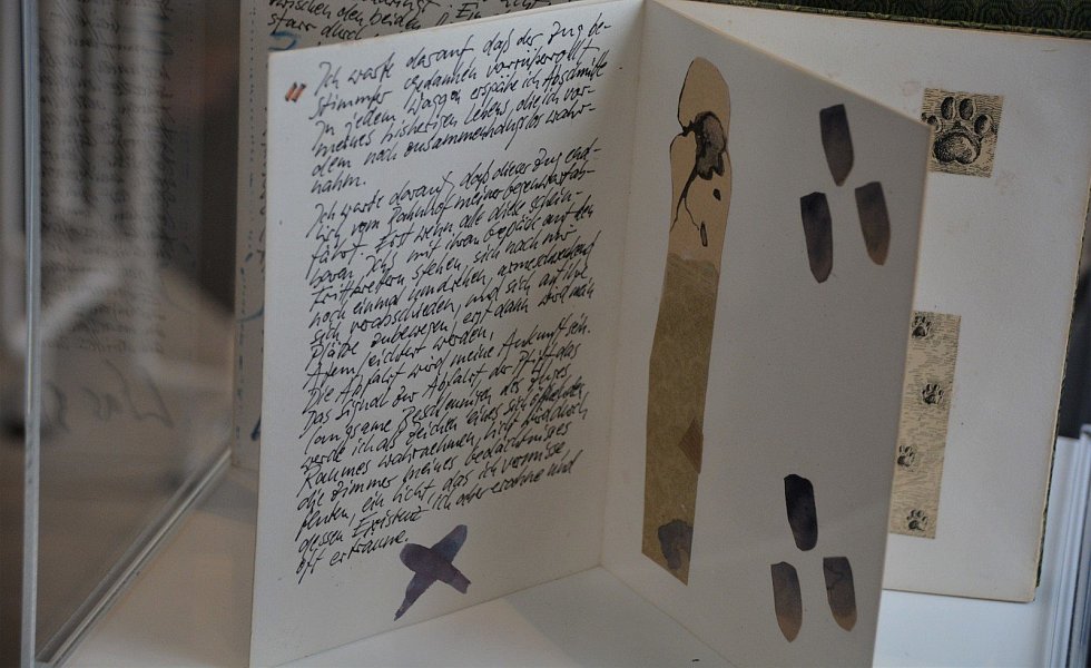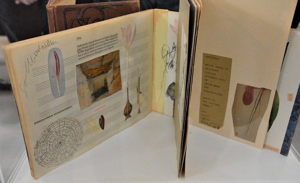 Drei gläserne Vitrinen stehen verteilt im Raum der Alten Synagoge. Die Besucher beugen sich hinunter, um kurze oder längere Texte in kleinen Heften oder auf Notenblättern, geschrieben zum Teil von Hand, aufgeklebte Blüten und Skizzen zu betrachten. Wer die Treppe hinuntergeht, stößt auf fünf kleine Skulpturen. "Die Geister, die ich rief", hat Jürgen Heinrich sie genannt. Mit ihnen, erzählt der 57-Jährige, habe alles angefangen.