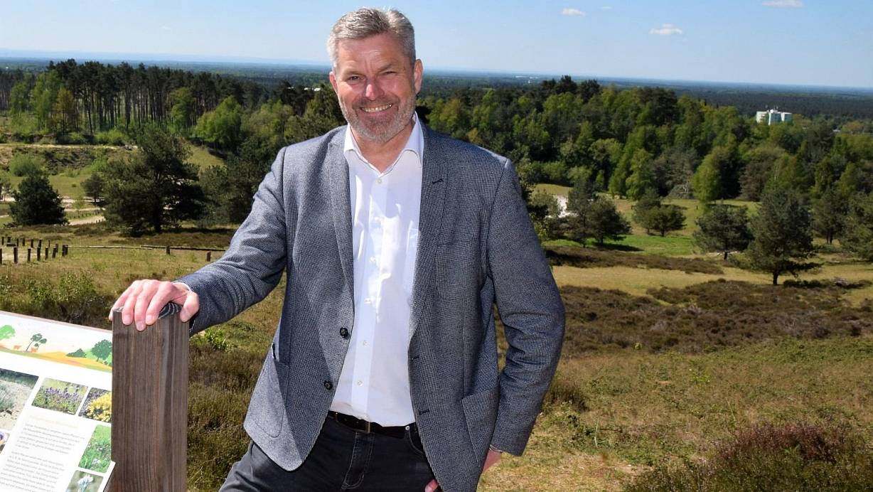 Oerlinghausens Bürgermeister Dirk Becker steht an den Oerlinghauser Fliegerkuppen, die den vorläufigen Schlusspunkt bei der Neugestaltung der Sennelandschaft im Naturschutzgroßprojekt bilden. | © Horst Biere