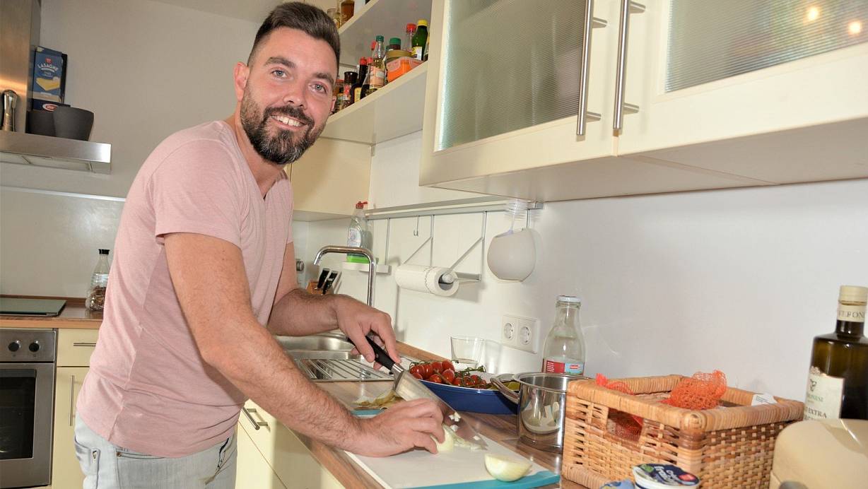 Tobias Nixdorf schneidet in der heimischen Küche Zwiebeln. Bei der Kochshow hat der Bergstädter wegen der Corona-Auflagen in das Kochatelier Bielefeld ausweichen müssen. | © Karin Prignitz