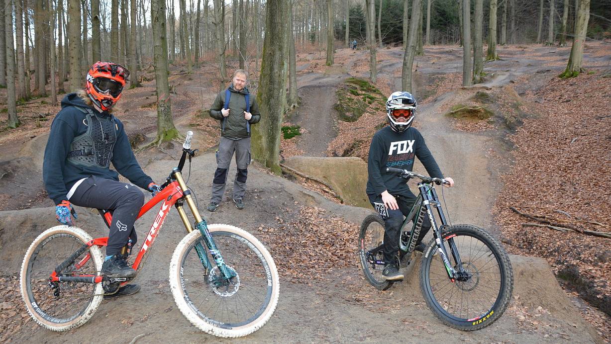 Malte Bax, Heiko Romankiewicz und Falk Bodenstab (v. l.) gehören zu denen, die die Mountainbikestrecke im Schopketal regelmäßig nutzten. Kurz nachdem das Foto entstanden ist, hatten die Baumfäll- und Abbauarbeiten an der Anlage begonnen. | © Karin Prignitz