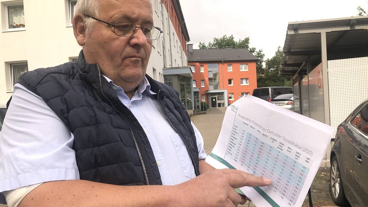 Seine Partei „Die Linke" geht mit einem Programm in den Wahlkampf „für die Menschen", wie Brinkmann sagt. Sie will einen Mindestlohn von 13 Euro, abschlagsfreie Rente ab 65, bezahlbare Wohnungen für alle.„Das sind alles Ziele mit direkten Folgen für die Menschen hier", sagt er und zeigt auf ein Papier, das ausgewählte Daten der Detmolder Sozialstruktur zusammenfasst.