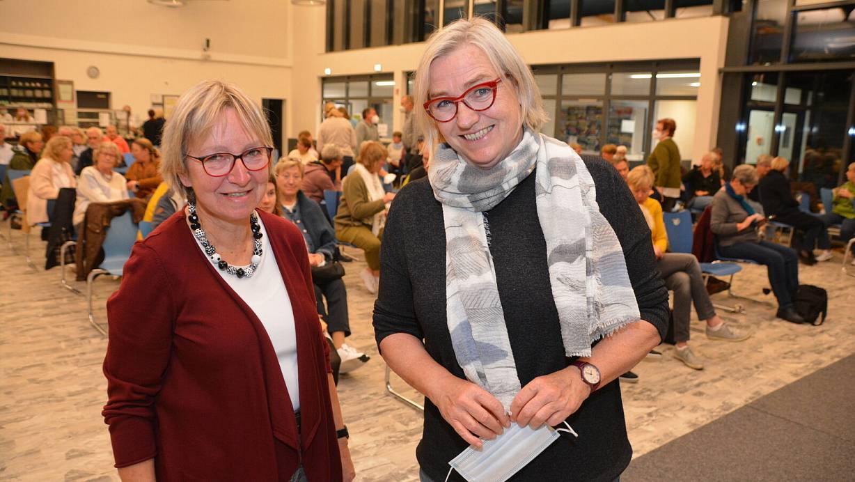 Martina Lange (l.) kann Erfolgsautorin Mechtild Borrmann bereits zum wiederholten Male in Oerlinghausen begrüßen, diesmal in der Mensa der Heinz-Sielmann-Schule. | © Karin Prignitz