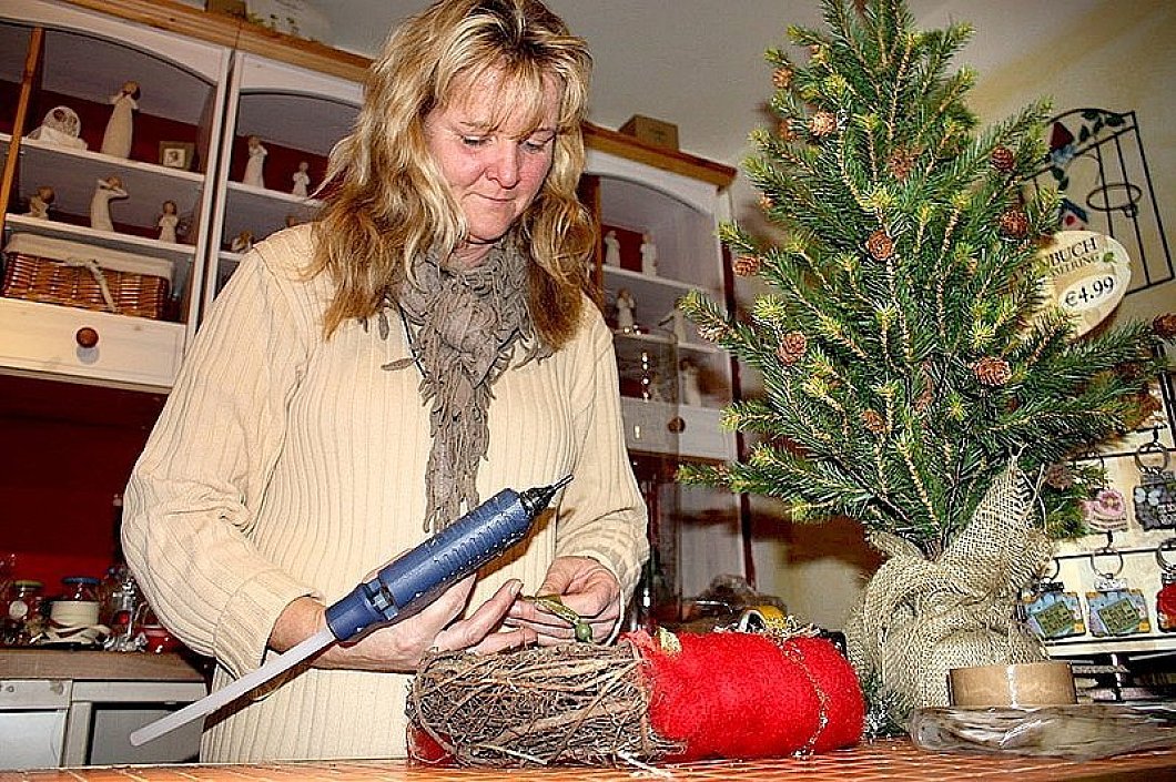 Das Schaufenster ist festlich dekoriert, denn ihr steht die arbeitsreichste Zeit des Jahres bevor. Schließlich verkauft sie Dekorations- und Geschenkartikel, und die haben in der Adventszeit bekanntlich Hochsaison. "Die typischen Deko-Weihnachtsmänner gibt es allerdings kaum noch", erklärt sie, während sie in mühevoller Kleinarbeit einen ausgefallenen Adventskranz kreiert.