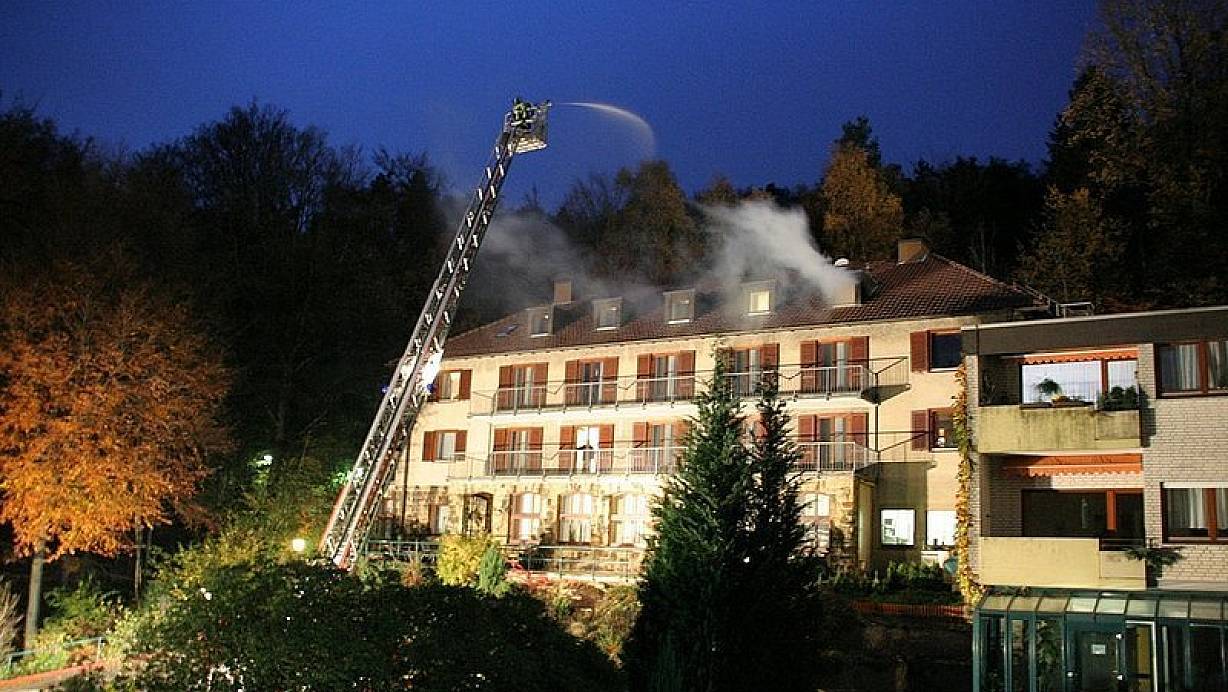 Oerlinghausen (kb). Dicker Rauch quoll am späten Donnerstagnachmittag aus dem Dachgeschoss des BKK-Heimes am Lehmstich. In dem mehrstöckigen Gebäude war ein Brand ausgebrochen. Ein Mensch hatte sich schwer verletzt, als sie sich offenbar vor dem Feuer in Sicherheit bringen wollte und aus dem Fenster gesprungen war. Zwei weitere Personen konnten sich auf ein benachbartes Flachdach retten. Die Feuerwehr Oerlinghausen war binnen zehn Minuten vor Ort.