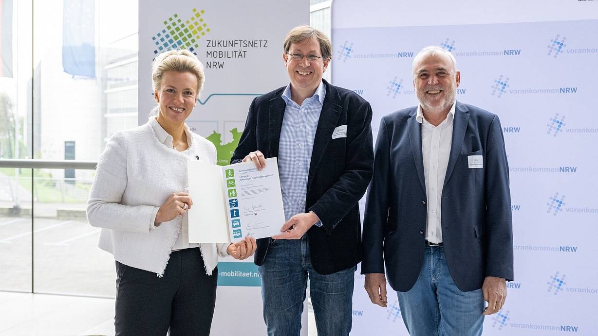 Leopoldshöhe/Köln/Düsseldorf. In der Gemeindeverwaltung Leopoldshöhe gibt es nun einen Mobilitätsmanager. Michael Kriszan von der Stabsstelle Klimaschutz und Mobilität wird künftig das Thema Mobilität in der Verwaltung koordinieren und neue Projekte für eine bessere Mobilität anstoßen. Nach seiner erfolgreichen Teilnahme am Lehrgang „Kommunales Mobilitätsmanagement“ des Zukunftsnetzes Mobilität NRW überreichte die Verkehrsministerin des Landes Nordrhein-Westfalen, Ina Brandes, Michael Kriszan jetzt seine Urkunde.