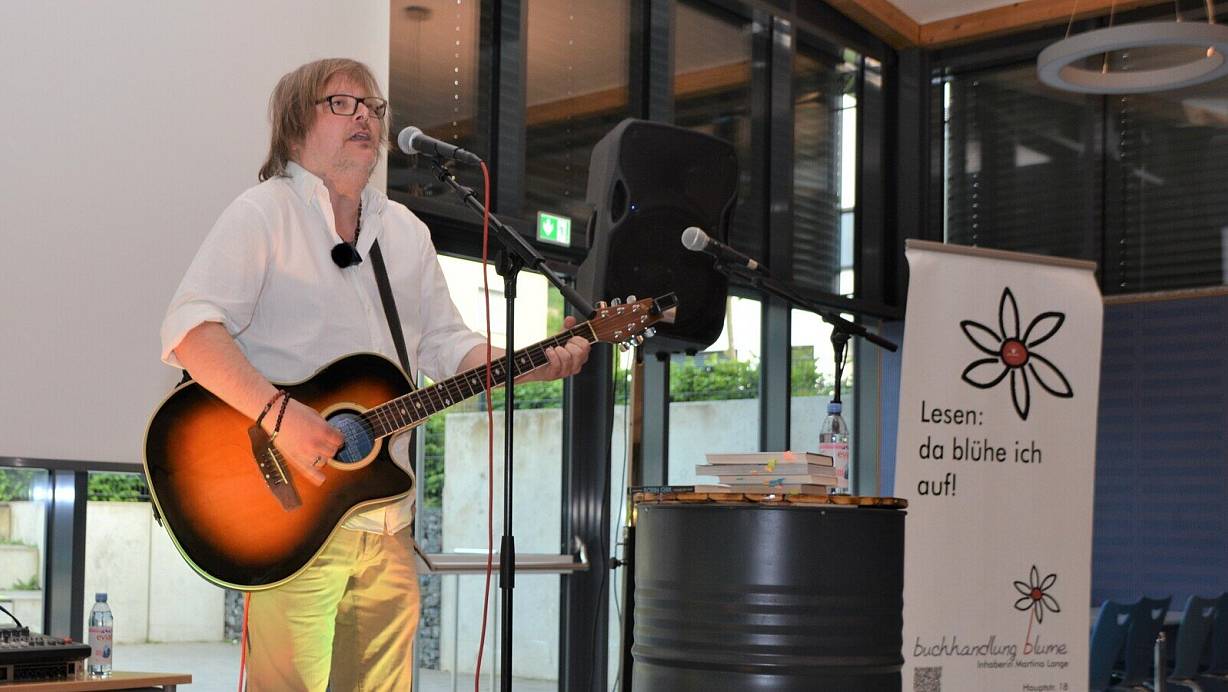 Robin Gibb („Robin Gibb und die Bee Gees“), Eric Clapton („Ein Leben für den Blues“), David Bowie („Stardist Interviews“) und die Beatles („The Beatles“ von Frank Goosen), auch ihnen widmet Stefan Just literarisch und mit Gesang Teile des unterhaltsamen Abends. Bei dem werden die insgesamt 80 Besucher zwischendurch aufgefordert, mitzusingen, und folgen dem nach anfänglich zaghaften Tönen zunehmend gerne. Stefan Just hat die Mischung zwischen Literatur und Musik klug gewählt. Auch, wenn er sich ab und zu selbst zügeln muss, denn eigentlich könnte er noch viel mehr über all die Musiker erzählen, die ihn so sehr geprägt haben, „aber das ist eine andere Geschichte“, sagt er ein ums andere Mal.