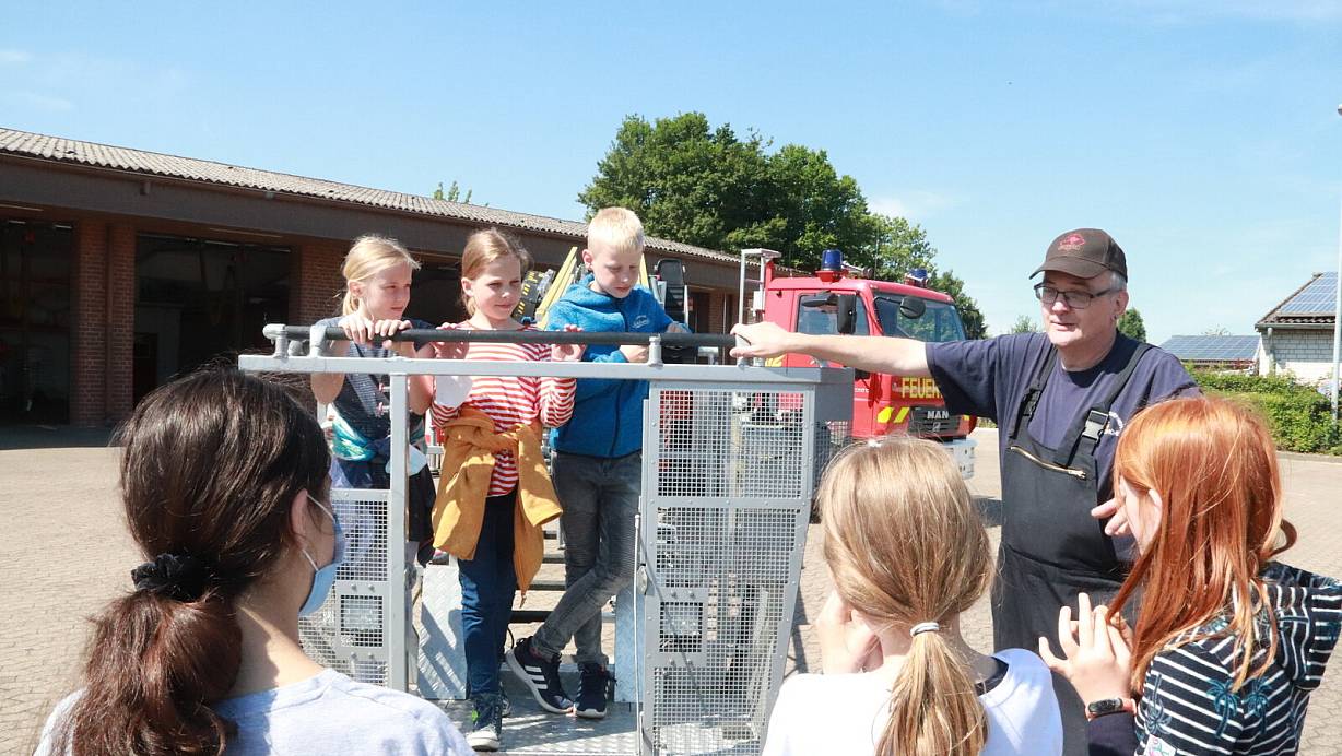 Für Lasse, Aylin und die anderen Viertklässler war der Wagen mit der Drehleiter eindeutig am interessantesten. „Die Leiter kann bis zur 18 Meter hoch ausgefahren werden, das reicht bis zur Kirchturmuhr“, erläuterte Jörg Kluckow. Mit dem Korb durften die Schüler zwar nicht in die Höhe, aber der Feuerwehrmann machte ihnen einen Vorschlag. „Jeden Montag habt ihr die Gelegenheit, ab 18 Uhr trifft sich die Jugendfeuerwehr“, sagte er.
