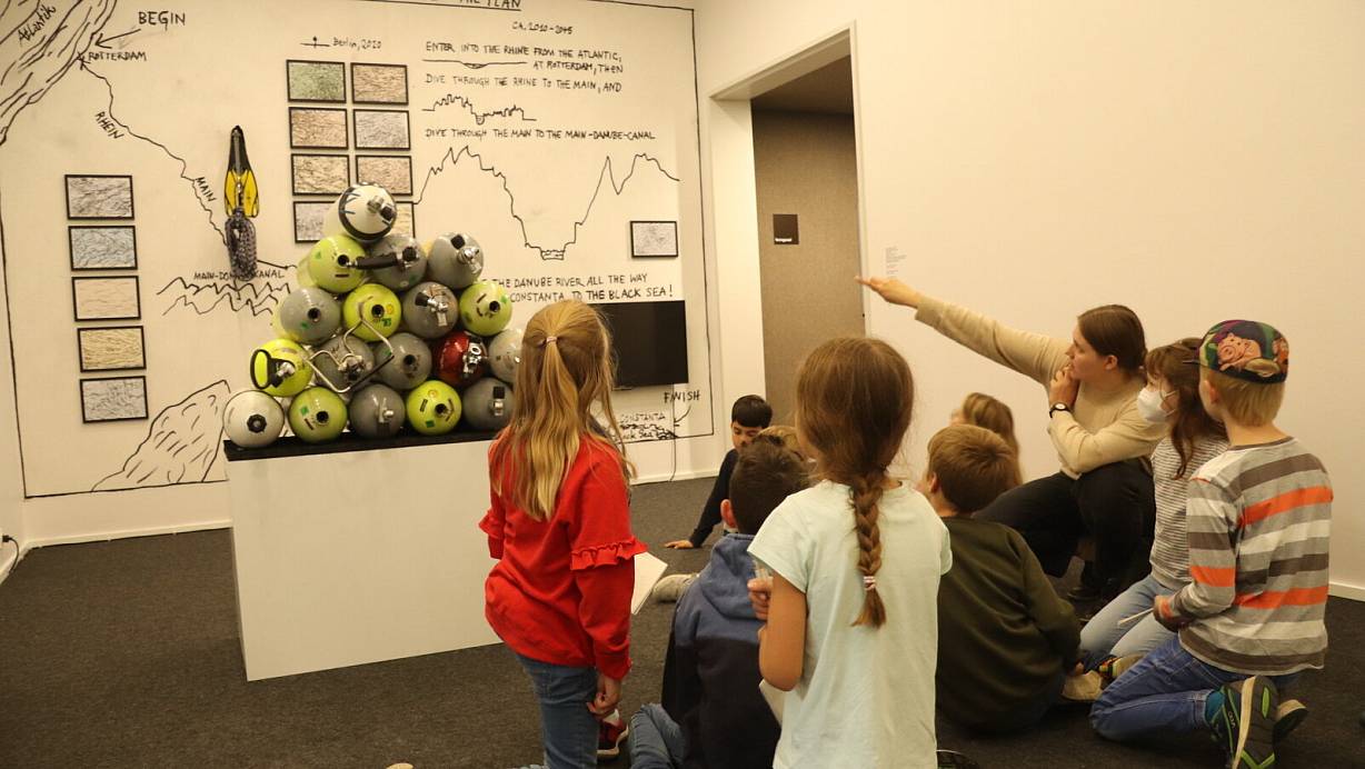 Jana Topel (r.) erklärt den Mädchen und Jungen der Grundschule Nord in der Bielefelder Kunsthalle die Geschichte hinter der Installation von Klara Hobza und ihrer Tauchreise durch Europa. 19 Sauerstoffflaschen gehören auch dazu. | © Birgit Guhlke
