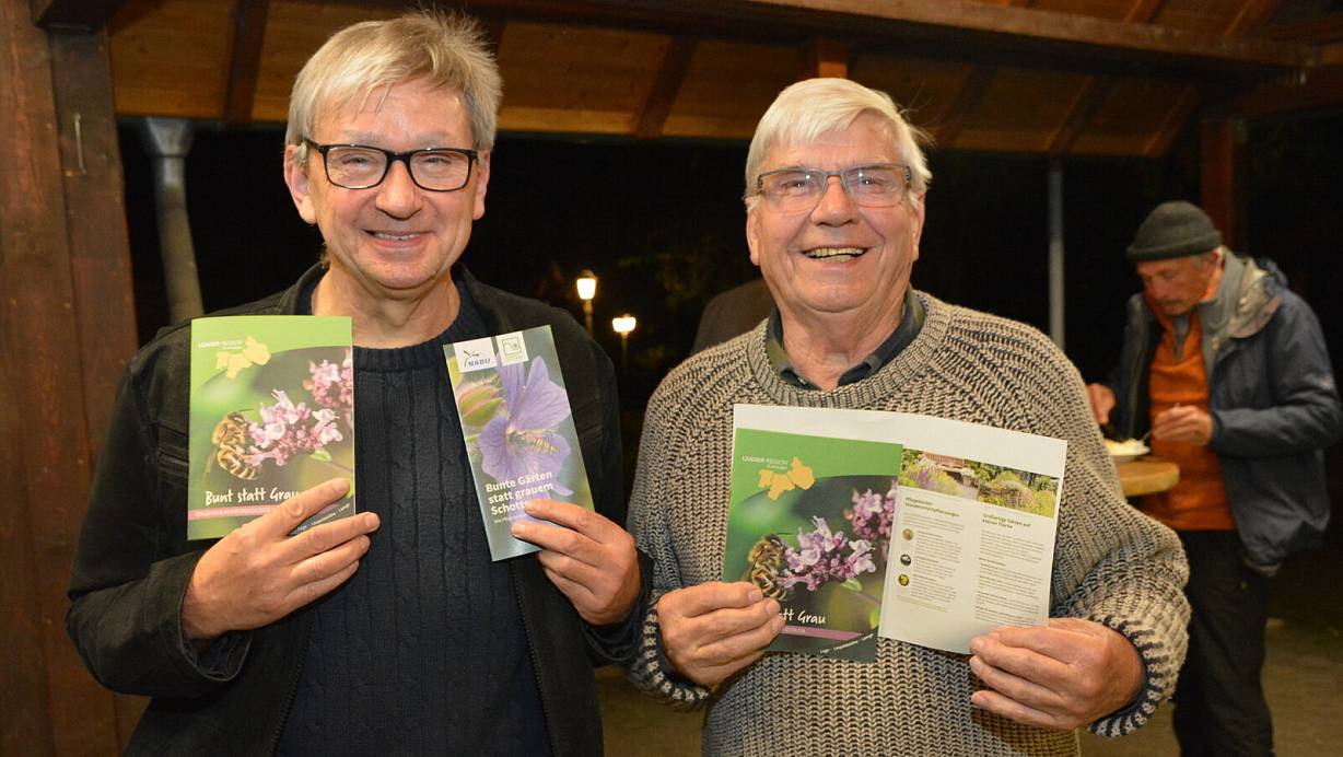 Insektenspezialist Hans Dudler (l.) und Gärtner Ulrich Käthner halten Broschüren in den Händen, in denen aufgezeigt wird, welche Alternativen es zu Schottergärten gibt. | © Karin Prignitz