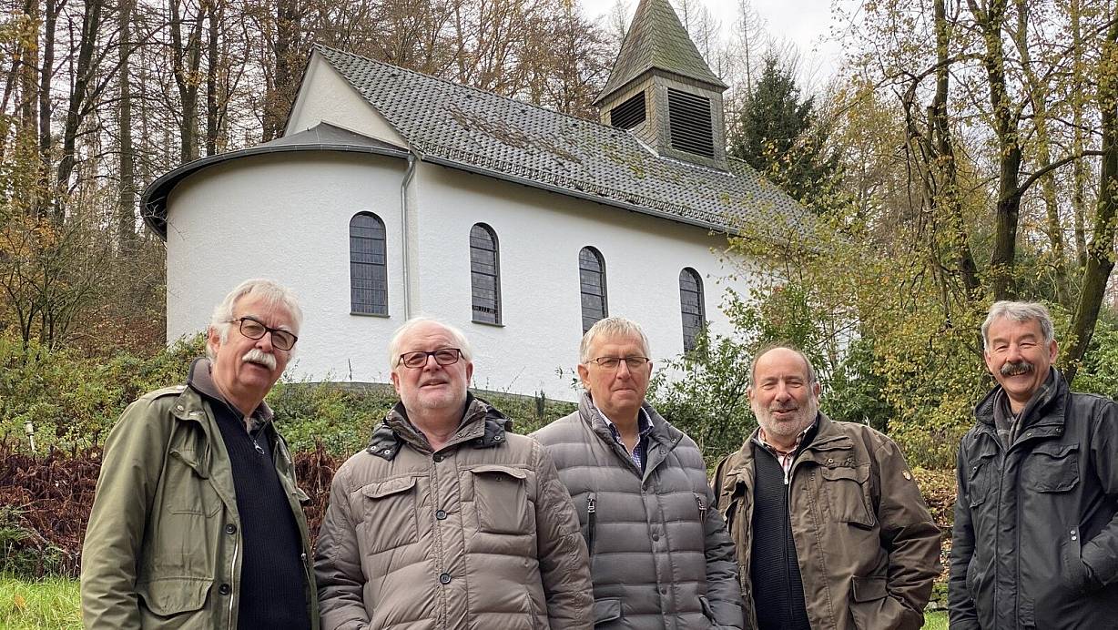 Viel Engagement zusammen mit handwerklichem Know-how zeigen die ehrenamtlichen Helfer. Johannes Stefan Müller (v. l.), Wilhelm Kleinemeier, Josef Wolfförster, Hans-Gerd Lappe und Bernd Müller renovieren die Hedwigskapelle an der Hermannstraße. | © Horst Biere