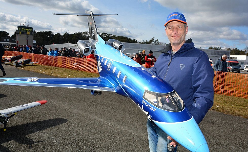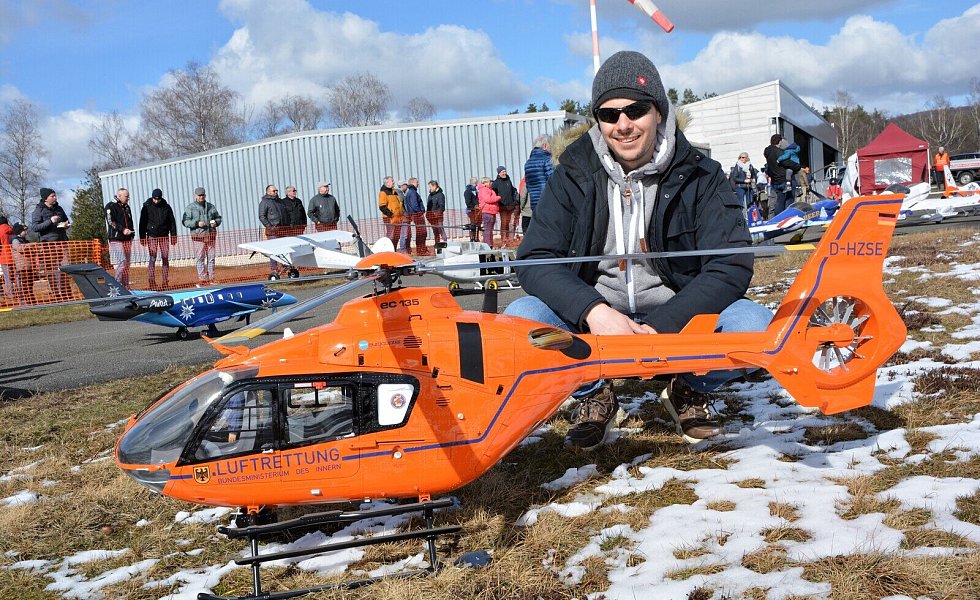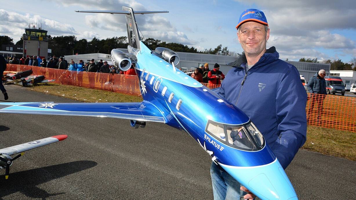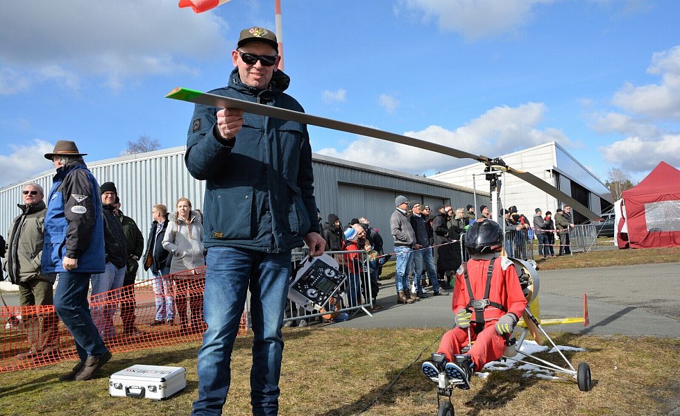 Harald Booms ist zum ersten Mal bei der Modellflugshow vertreten. „Der Hauptrotor wird vom Wind angetrieben“, erläutert der Münsterländer. Alles ist komplett von Hand gefertigt. Sogar die 1,30 Meter große Figur, die den Tragschrauber scheinbar steuert und die Füße synchron bewegt. Tatsächlich hat der Kfz-Meister einen ausgeklügelten Mechanismus entwickelt. Unter den Teilnehmern, die ihre höchst unterschiedlichen Modelle in einer langen Schlange hintereinander parken, bis sie starten können, ist Robert Sixt aus Rosenheim. Im Jahr 2018 hat er mit 278 Stundenkilometern den Weltrekord im Helikopter-Speedfliegen auf gerader Strecke aufgestellt. „Dieser Rekord ist immer noch gültig“, erzählt der Bayer. In Oerlinghausen ist er mit drei Modellen am Start. Das Auffälligste ist die Pilatus PC 24.
