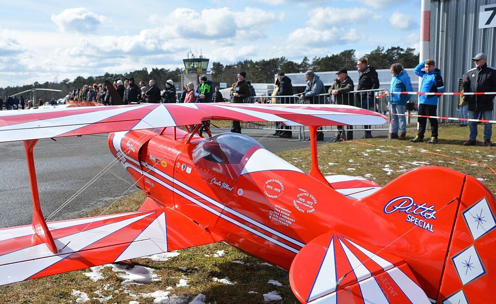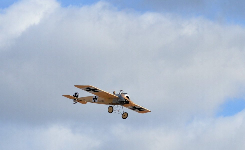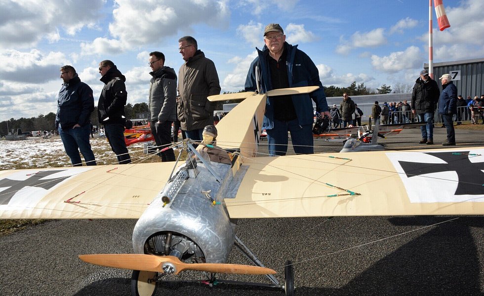 „Hier kann man die Geschichte der Fliegerei von ihren Anfängen verfolgen“, verweist Hermann Wirtz aus Jülich auf die große Bandbreite der imposanten Flugmodelle. Er selbst wartet auf den Start mit seiner Fokker E III. „Besonderheit ist, dass sie keine Querruder hat und sich die Tragflächen komplett drehen – genau wie beim Original.“ 500 Stunden hat der Rheinländer gebaut, bis das Modell mit einer Länge von 2,35 Metern und einer Spannbreite von 3,20 Metern fertig war. „Wenn sich das Ruder bewegt, bewegt sich auch der Steuerknüppel“, erläutert Wirtz und führt den Effekt vor. Transportiert hat er die Fokker im Wohnmobil. Wirtz ist mit der ganzen Familie in die Bergstadt gekommen. Auch Enkel Leo ist dabei. Was der später einmal werden möchte, steht für den Dreijährigen bereits fest: „Pilot.“