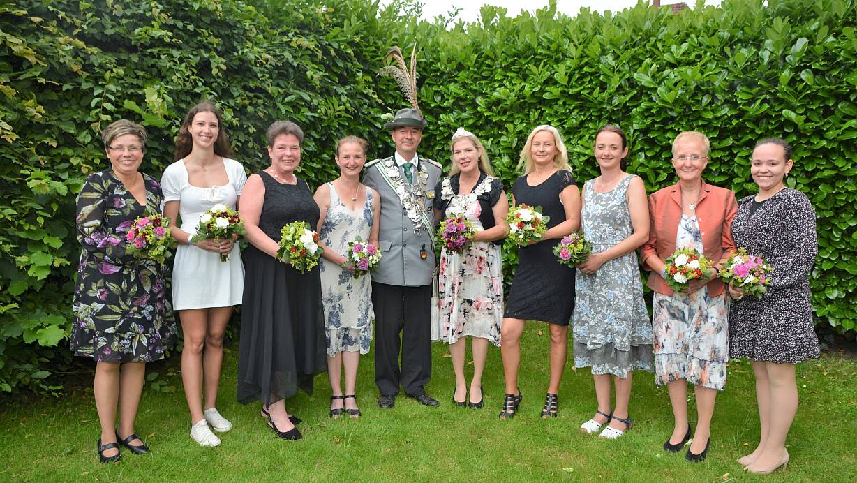 Das neue Regentenpaar Dirk Ciesla und Elke Exner (Mitte) und die Throndamen Frauke Nixdorf, Nadine Schindowski, Anja Hilker, Britta Ciesla sowie Ivette Klocke, Jana Meyer, Inge Schindowski und Daria Bunte (v. l.) freuen sich auf ein schönes Schützenjahr. | © Karin Prignitz