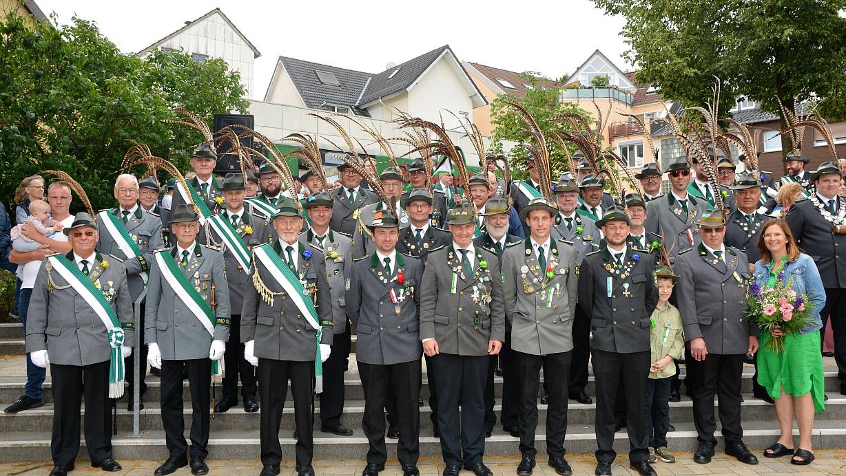 Oerlinghausen. Eine ganze Reihe von Schützenbrüdern und -schwestern waren am Sonntag auf dem Rathausplatz für ihre jahrzehntelang Vereinstreue ausgezeichnet worden, andere wurden befördert. Eine hohe Ehre wurde Hans Klocke und Ernst Möller zuteil. Beide erhielten die Kölner Medaille des Westfälischen Schützenbundes (WSB). Das WSB-Ehrenzeichen in Gold konnte Kristian Hoffmann persönlich entgegennehmen, es ging außerdem an Udo Fillies. Die Ehrennadel des WSB wurde Markus Höhne und Raphael Peters verliehen, die Verdienstnadel des WSB Jens Dahlke, Bastian Dawitz und Alexander Reinecke.