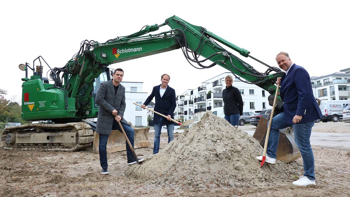 Der Bagger steht bereit, Robert Mainka (S2 Immobilien- und Projektentwicklung, von links), Kay Sandmann-Puzberg, Desiree Klein-Avink (beide Wortmann Family Office) und Thomas Schröder (Wortmann Immobilien Projekt) freuen sich darauf, dass es an den Werreterrassen mit den nächsten Wohnungen weitergeht. | © Alexandra Schaller