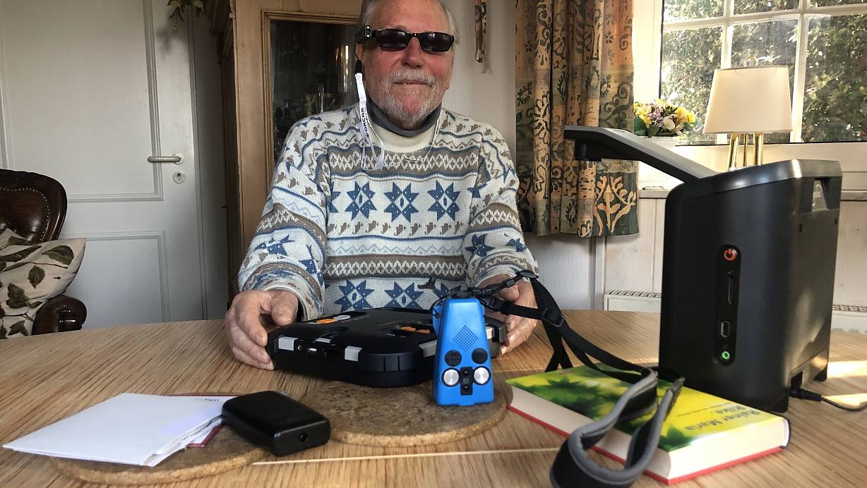Vor Gerhard Steffen liegen verschiedenen technische Hilfsmittel, die ihm das Leben erleichtern. Ganz rechts ist das Vorlesegerät zu sehen, das Texte erkennt, die man unter die Kamera legt. | © Sven Kienscherf