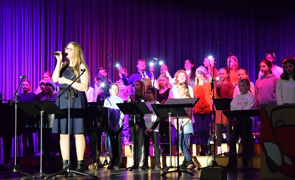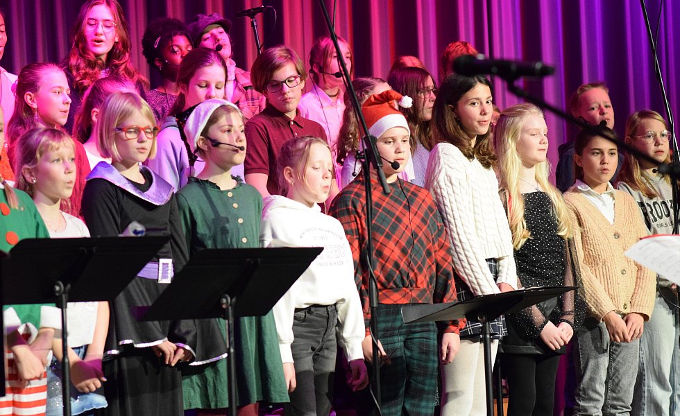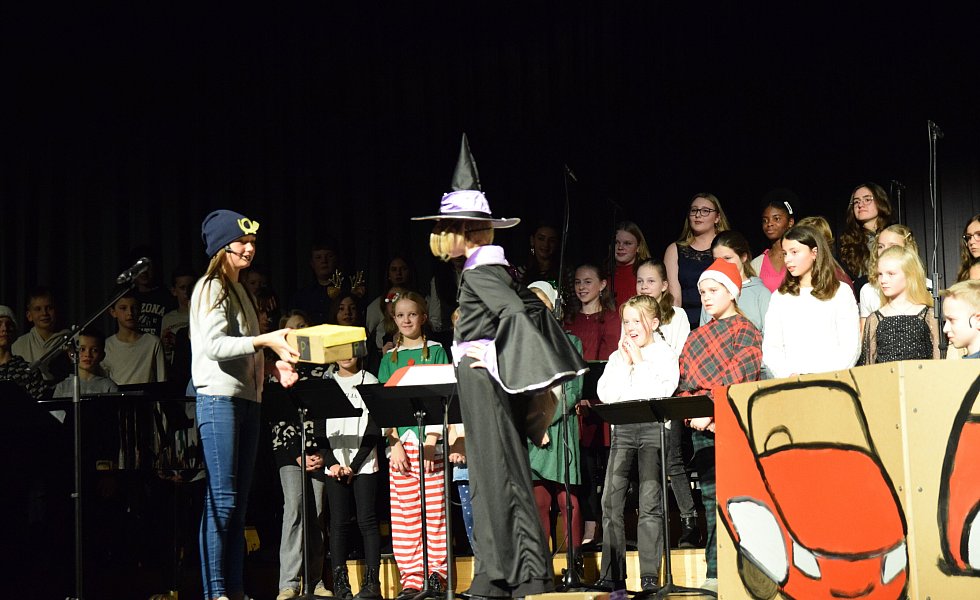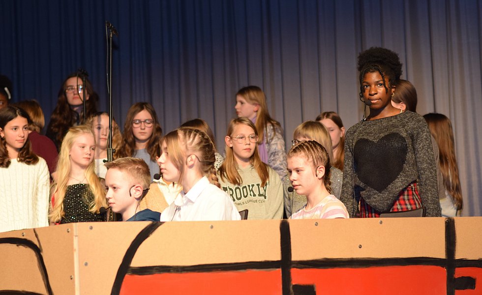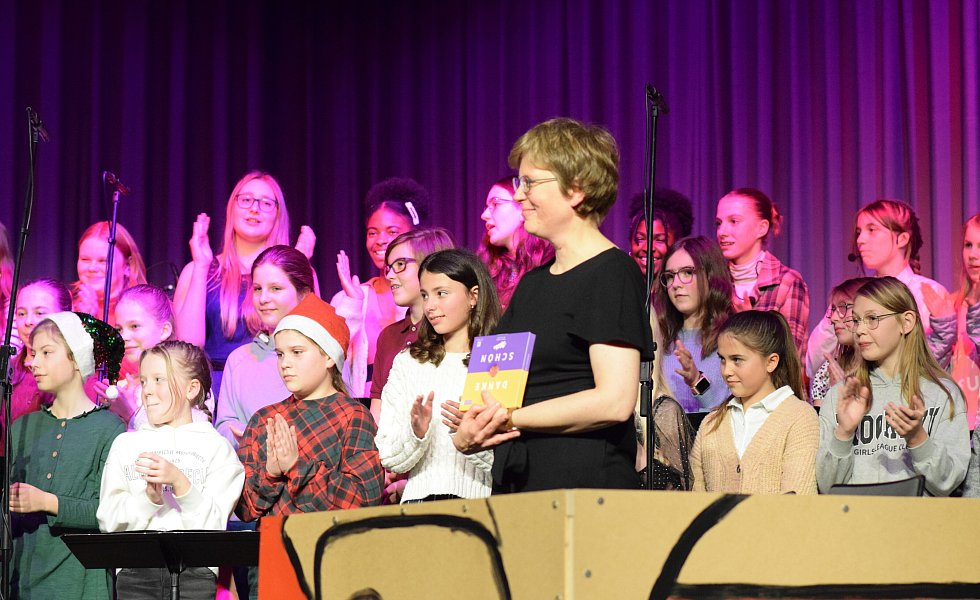 Wie üblich blieb es nicht allein beim Singen. Die einzelnen Stücke wurden in eine Geschichte gepackt, die in die Zeit passte. In der gefüllten Aula bekamen das Auditorium „Ein etwas anderes Weihnachtswunder“ zu sehen und zu hören. Die Neuntklässlerinnen Gloria Litig und Lily Buchholz hatten die Texte verfasst und weil das Interesse eben so groß war, fix noch ein paar Rollen hinzugeschrieben. Menschen aus unterschiedlichen Ländern bleiben in einen Flixbus im Schnee stecken. Pünktlich unterm Weihnachtsbaum? Dieser Traum ist schnell ausgeträumt. Also macht die Gruppe das Beste daraus und erzählt, wie Weihnachten in anderen Ländern gefeiert wird.
