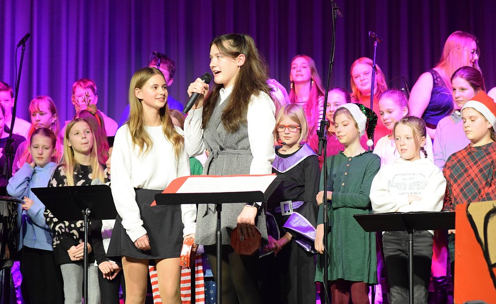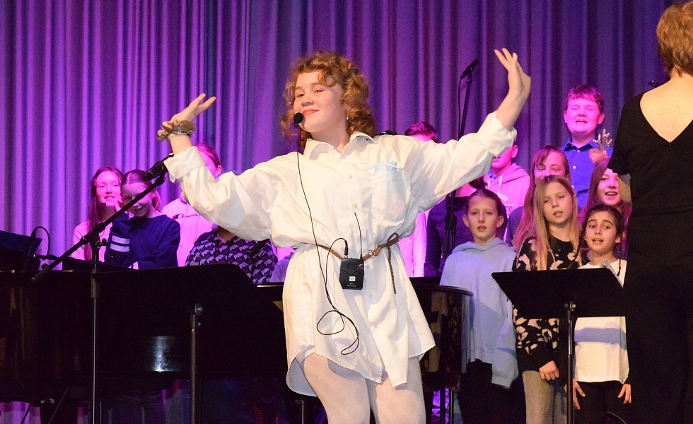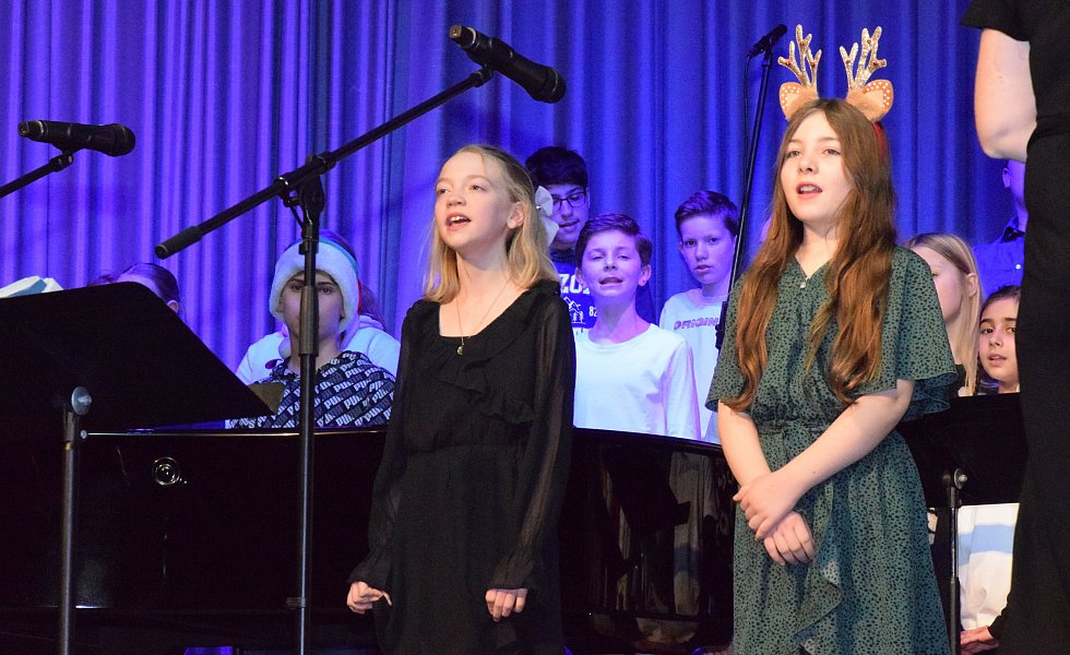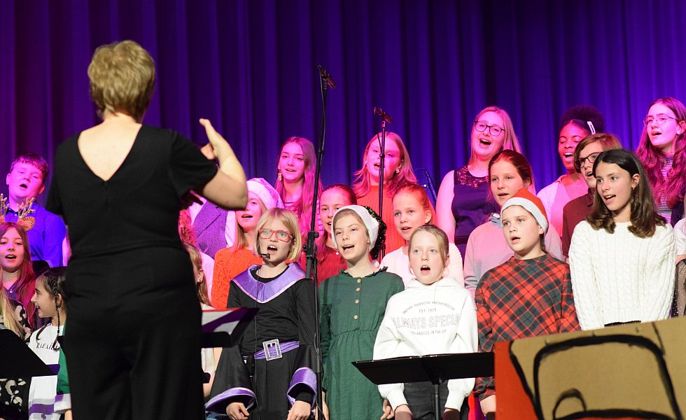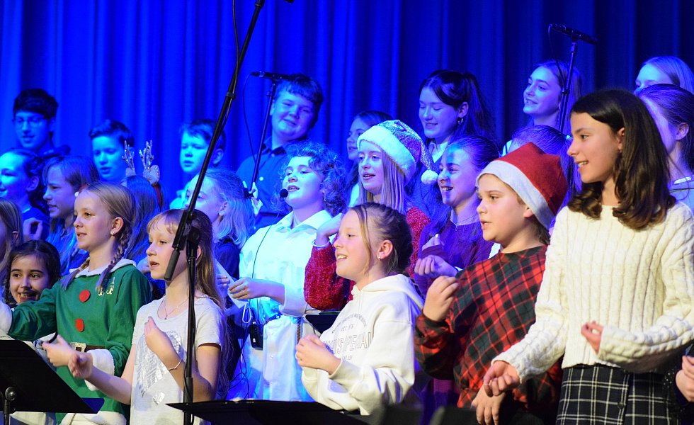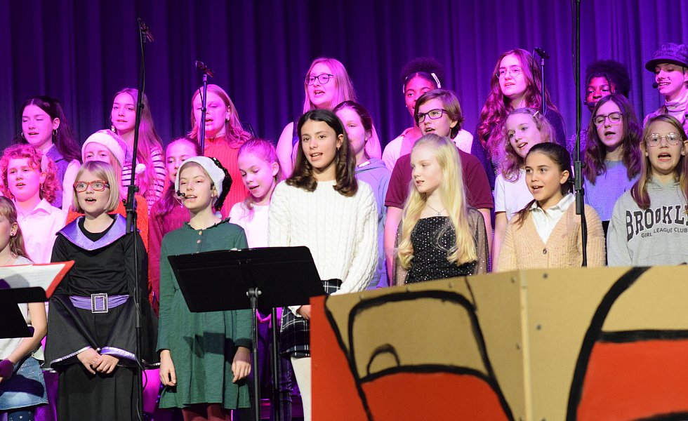 Wie üblich blieb es nicht allein beim Singen. Die einzelnen Stücke wurden in eine Geschichte gepackt, die in die Zeit passte. In der gefüllten Aula bekamen das Auditorium „Ein etwas anderes Weihnachtswunder“ zu sehen und zu hören. Die Neuntklässlerinnen Gloria Litig und Lily Buchholz hatten die Texte verfasst und weil das Interesse eben so groß war, fix noch ein paar Rollen hinzugeschrieben. Menschen aus unterschiedlichen Ländern bleiben in einen Flixbus im Schnee stecken. Pünktlich unterm Weihnachtsbaum? Dieser Traum ist schnell ausgeträumt. Also macht die Gruppe das Beste daraus und erzählt, wie Weihnachten in anderen Ländern gefeiert wird.