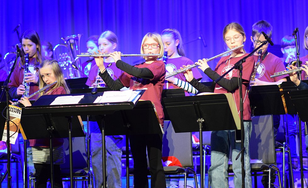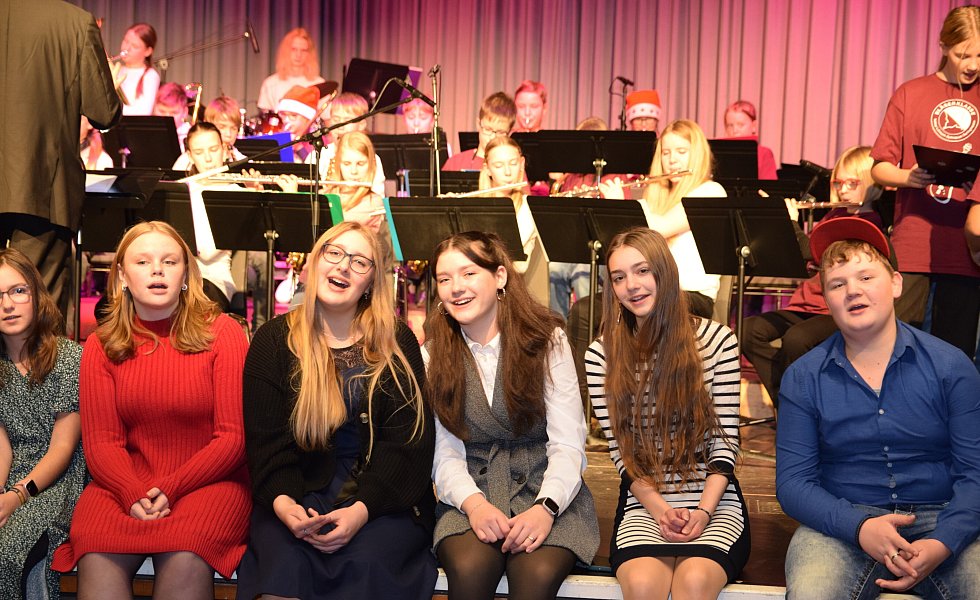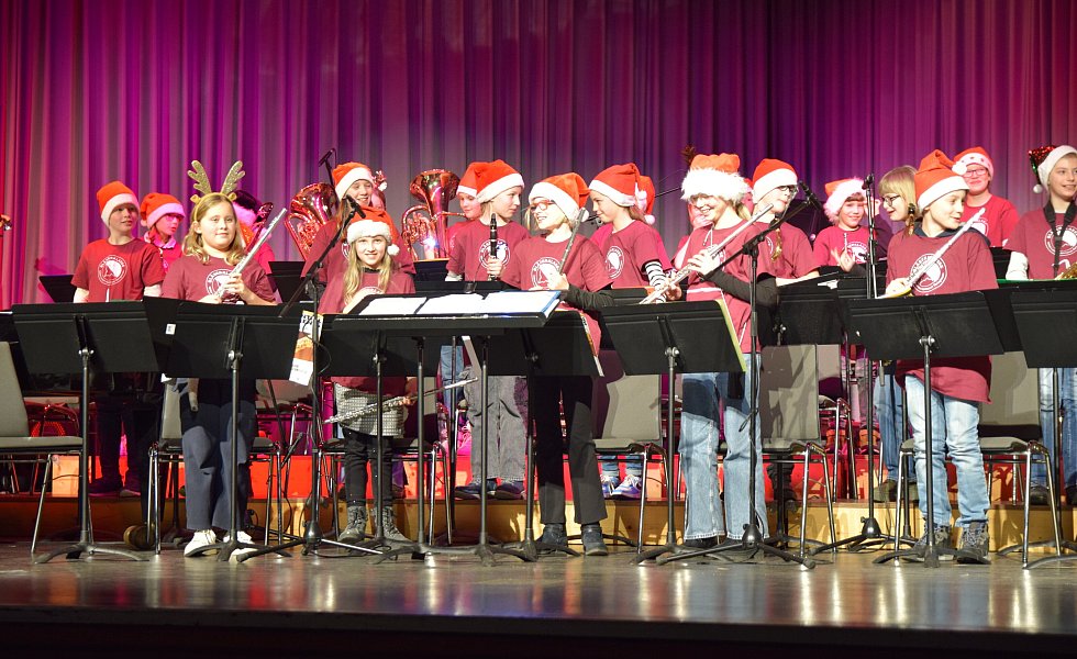 Nach Pause und Umbau übernahmen die Instrumentalisten des NLG die Bühne. Zunächst aber verkünden zwei Nachrichtensprecherinnen in einem „Newsticker“, welch katastrophale Auswirkungen der Beleuchtungseifer in der Advents- und Weihnachtszeit haben kann. Die Bläserklasse 5a nahm die Zuhörer augenzwinkernd mit in die Straßen und Stuben der Oerlinghauser Stadtteile und schließlich in das explodierende Holzheizkraftwerk. In der Aula wurde es dunkel, ein lautes Krachen war zu vernehmen. Als sich der hereingeblasene Rauch verzogen hatte, wuchs die Aufregung der Bläserklässler. Sie überwanden das Lampenfieber, setzten beim „Jingle Bells“ die roten Weihnachtsmützen auf und machten nach einer hardrockigen Zugabe schließlich die Bühne frei für die Junior-Big-Band.