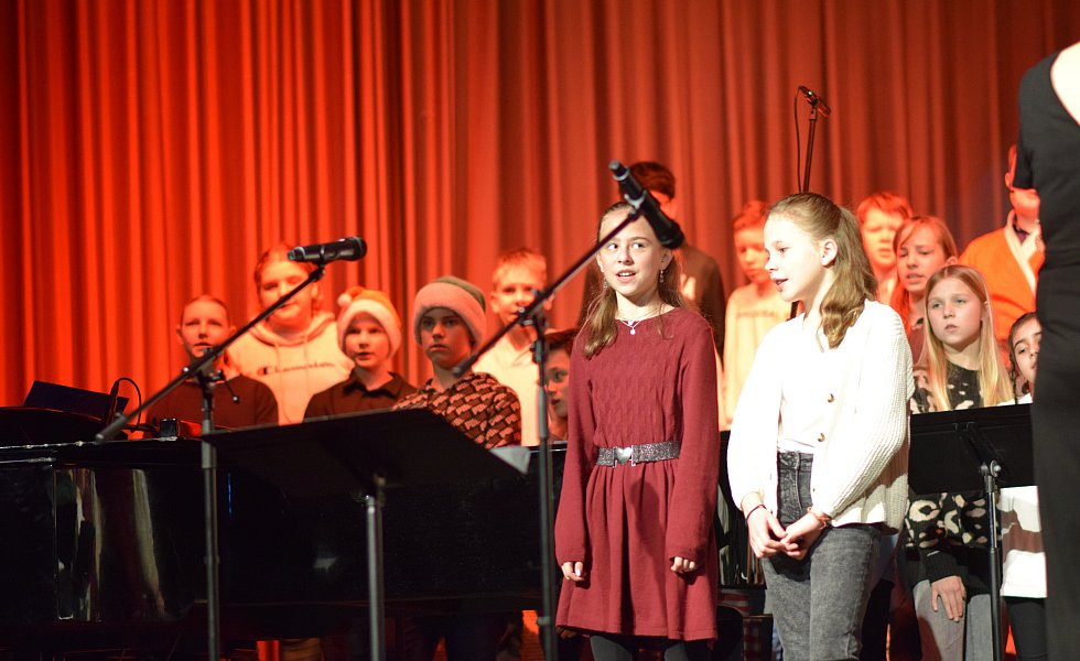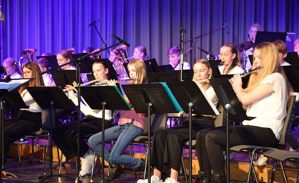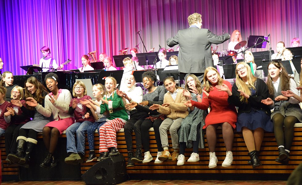 Schulleiterin Katrin Tebben kündigte gleich zu Beginn ein besonderes Konzert an, denn nicht nur die Bläserklasse 5a von Matthias Günther hatte ihren ersten Auftritt vor großem Publikum, auch Stefanie Dermann, die als dritte Musikpädagogin am Niklas-Luhmann-Gymnasium (NLG) unterrichtet und zwischenzeitlich für Alfons Haselhorst eingesprungen war, dirigierte erstmals die Chor-AG I der Jahrgänge 5 bis 9. Dass 57 Gymnasiastinnen und Gymnasiasten auf der Bühne standen, war ebenfalls ein Novum und zeigt ganz offensichtlich, wie groß die Freude am gemeinsamen Gesang ist.