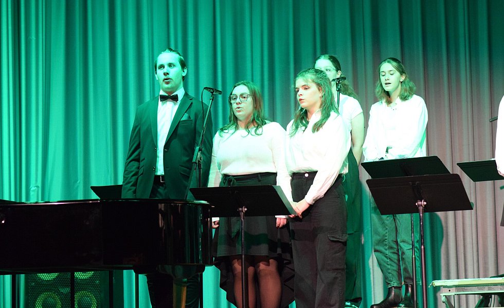 Oerlinghausen. Der Vorhang schwebt zur Seite und ein Raunen geht durchs Publikum. So festlich gekleidet haben wohl selbst viele Eltern ihre Kinder nur selten gesehen. Die zwölf Sängerinnen und ein Sänger der von Alfons Haselhorst geleiteten Chor-AG II der Jahrgangsstufen 10, Q1 und Q2 sorgen allein durch ihr Erscheinungsbild für Aufsehen, erst recht aber mit ihrem ausdrucksstarken, mehrstimmigen Gesang, in dem es unter anderem um grüne Augen geht.