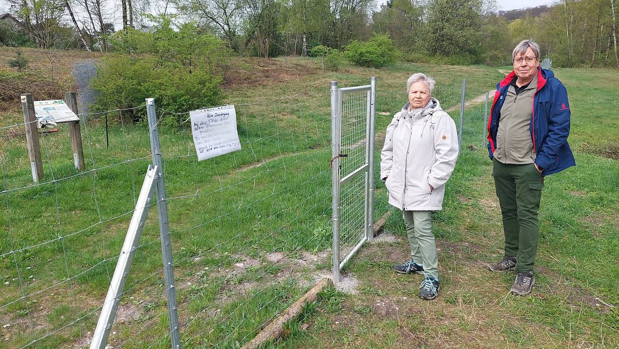 Ursula und Achim Kluck stehen am neu gezogenen Zaun. Dort hängt ein handgeschriebener Zettel. Die Infotafel dahinter ist nicht mehr zu erreichen. | © Karin Prignitz