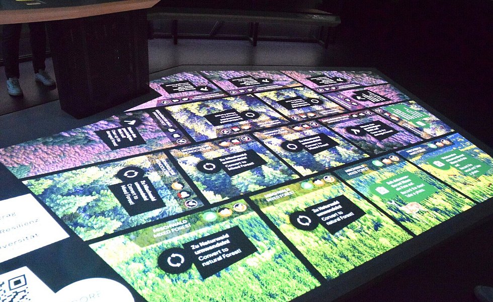 Im Raum 3 „Kehrtwende“ sind die Besucher Teil des Geschehens und können aktive Entscheidungen treffen. Sie bestimmen etwa Maßnahmen, die eine Stadt gegen Hitzeereignisse resistent machen, oder regeln den Hochwasserschutz.