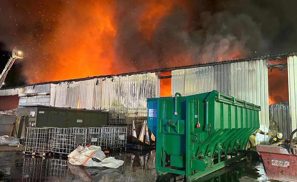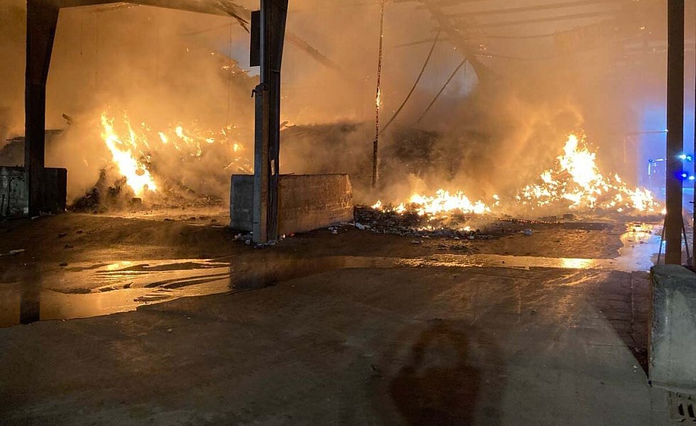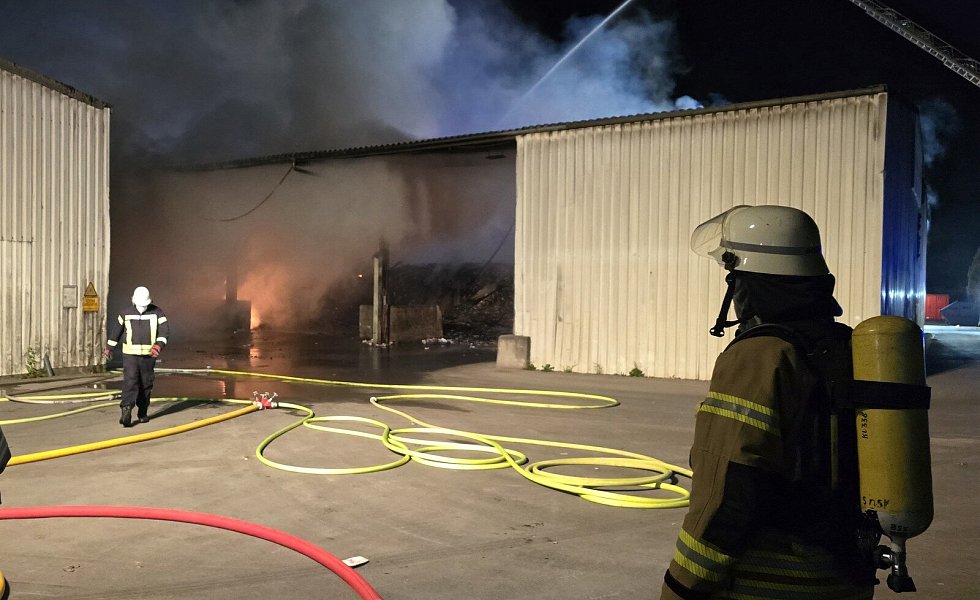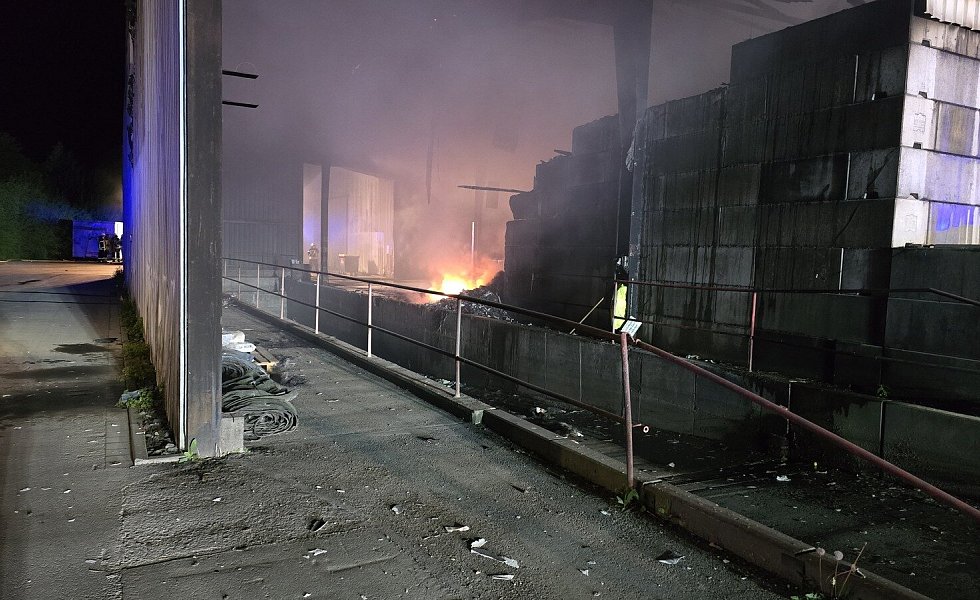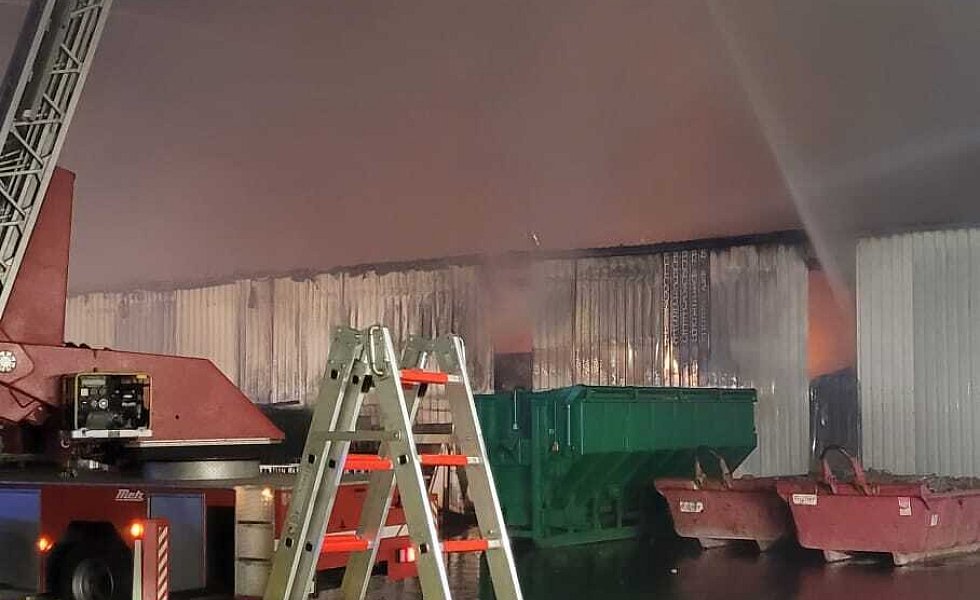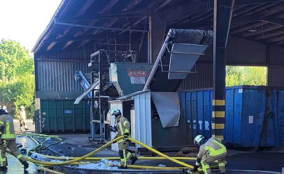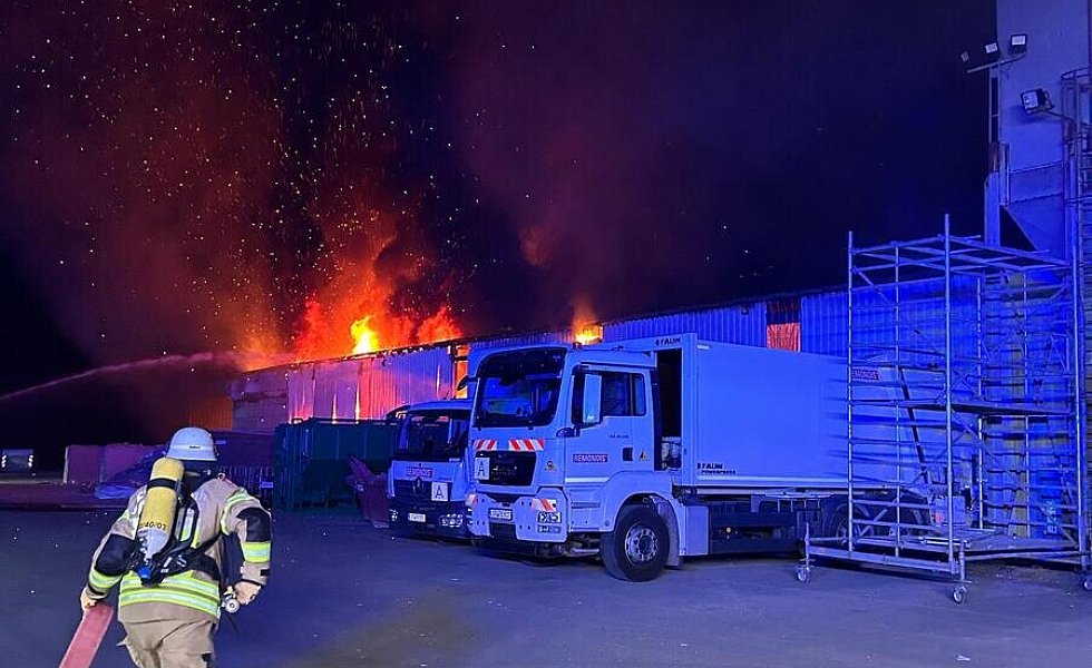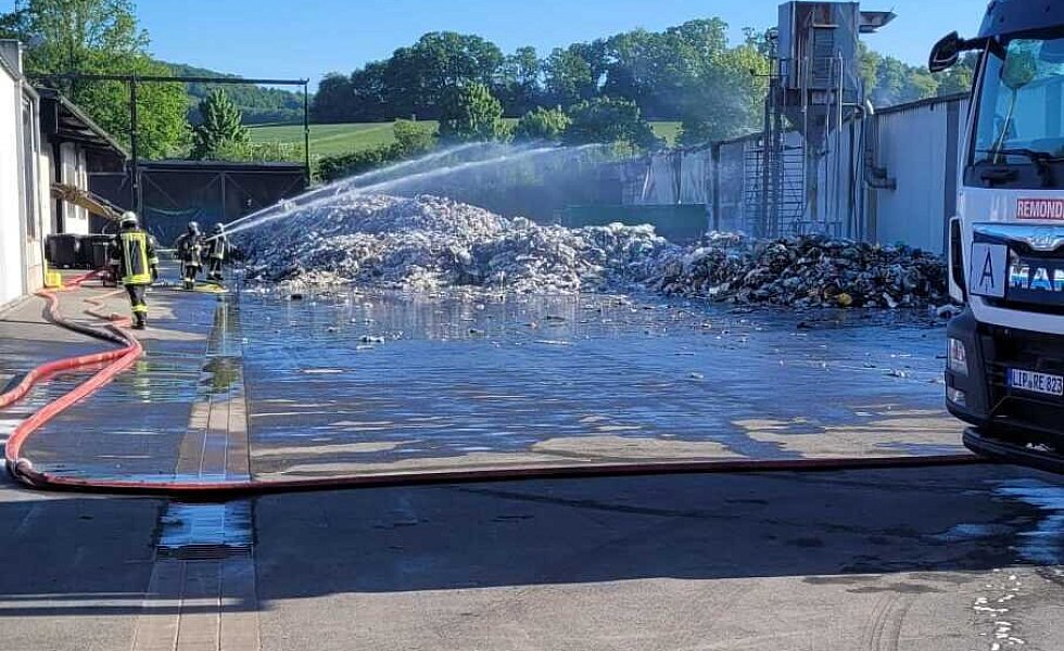 Dörentrup. In der Wertstoff-Sortierhalle des Abfallunternehmens Remondis ist am späten Montagabend ein Feuer ausgebrochen. Etwa die Hälfte des 125 mal 30 Meter großen Gebäudes habe gebrannt, teilte die Leitstelle noch am Abend mit. Ein Teil des Daches stürzte daraufhin ein. Anwohnerinnen und Anwohner wurden über die Warn-Apps Nina und Katwarn gebeten, Fenster und Türen wegen der starken Geruchsbelästigung geschlossen zu halten. Die Feuerwehr sperrte das Industriegebiet großräumig ab. Derzeit laufen noch Nachlöscharbeiten.