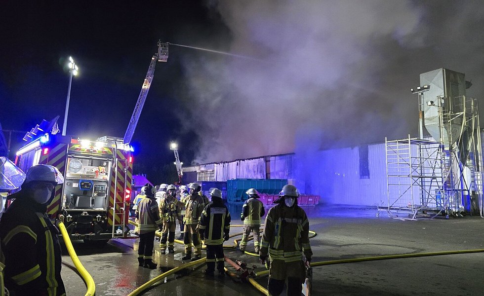„Der Notruf ging um 22.01 Uhr ein“, sagt Kevin Elliott, Pressesprecher der Dörentruper Feuerwehr. Schon auf der Anfahrt sei das Feuer deutlich sichtbar gewesen, sodass man das Einsatzstichwort direkt auf „Großbrand“ erweitert habe. Ausgebrochen sei der Brand in einer Halle, in der Müllsäcke aus den gelben Tonnen in der Region lagerten.
