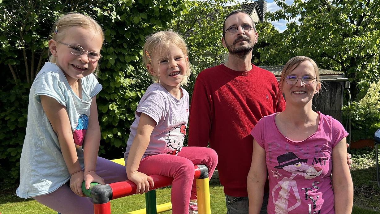 Hoffen auf einen OGS-Platz: Mirjam und Christian Thiessen mit ihren Töchtern, der fünfjährigen Celine (l.) und der dreijährigen Lenja, im heimischen Garten in Leopoldshöhe. | © Anna Lena Hinder