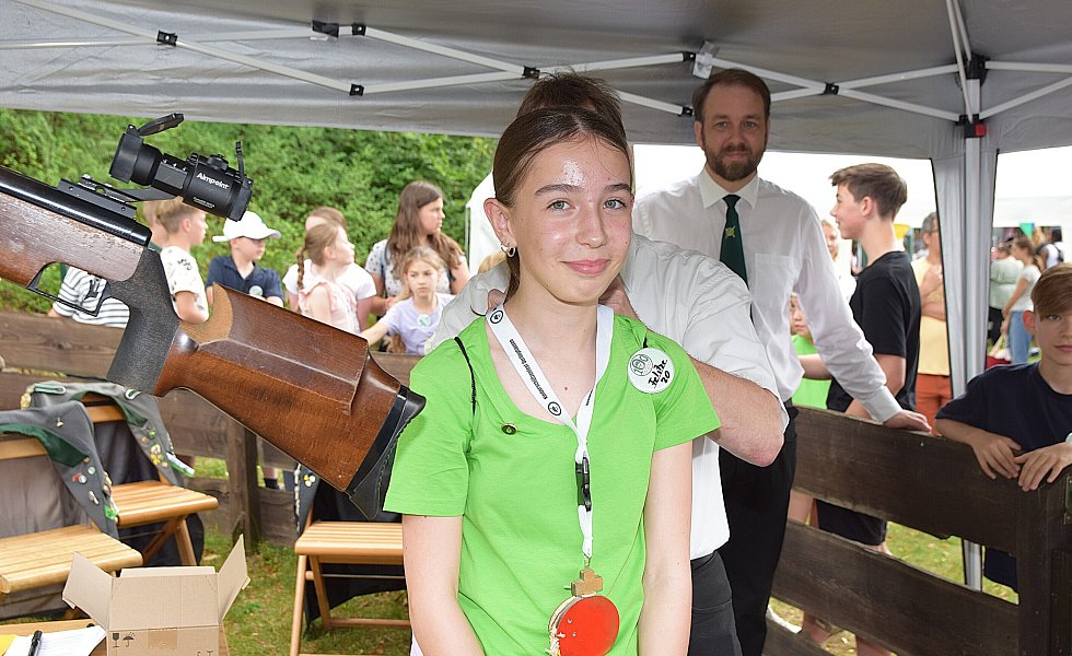 Im dritten Jahr nehmen auch Mädchen teil, und die sind diesmal nicht nur besonders stark vertreten (17 Mädchen und 17 Jungen wetteifern), sondern auch äußerst zielsicher. Bereits mit dem 17. Schuss holt Felitze-Johanne Beckmann (13) um 15.15 Uhr den Apfel herunter und wählt Ferdinand Stumpf (13) zum Prinzen an ihrer Seite. Schon acht Minuten später fällt das Zepter und Clara Hanke (11) kann jubeln, und zwar nach ihrem ersten abgegebenen und dem insgesamt 30. Schuss. Zepterprinz ist Clemens-Luis Kapelski (11).