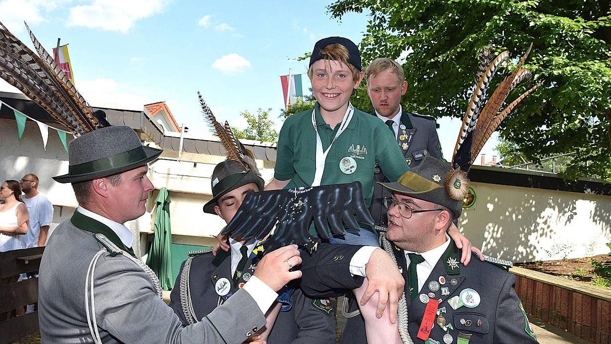 Um 15.35 Uhr zielt Cheerleaderin Carla Pfizenmaier (9) so genau, dass die Krone herunterfällt und mit ihr eine kleine Kette mit der Zahl 100. Zum Prinzen wählt sie Helge Drees (13). In der Folge wackelt und tanzt der Restadler, bis Jarne Landerbarthold den goldenen Treffer abgibt.