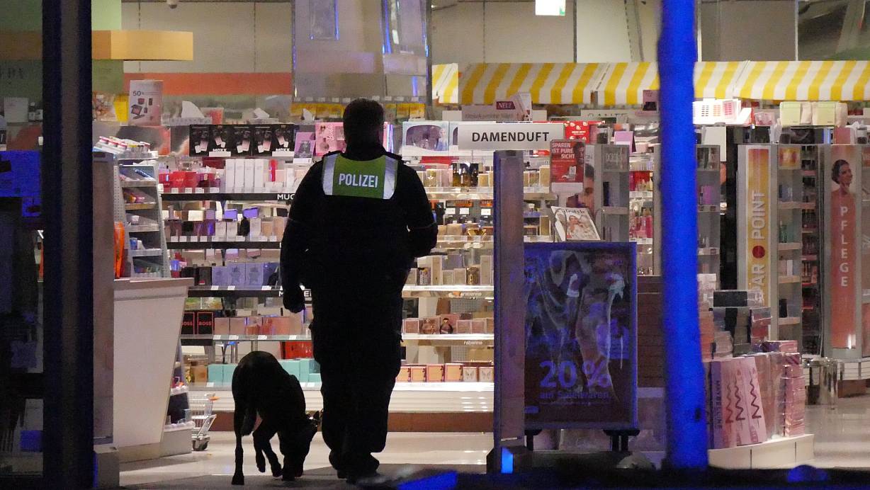 Mit einem Spürhund kontrolliert die Polizei nach Auslösung der Diebstahlwarnanlage im Müller, ob noch Personen im Geschäft sind. | © Jost Wolf