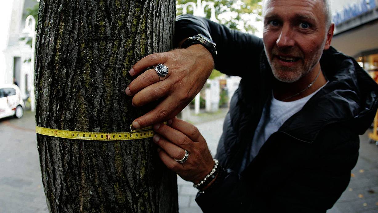 Dick genug: 94 Zentimeter Stammumfang misst Dirk Röckemann an dieser Linde gegenüber seinem Geschäft in der Herforder Straße. Damit wäre auch dieser noch recht junge Baum von der Baumschutzsatzung geschützt. | © Foto: Jörg Stuke
