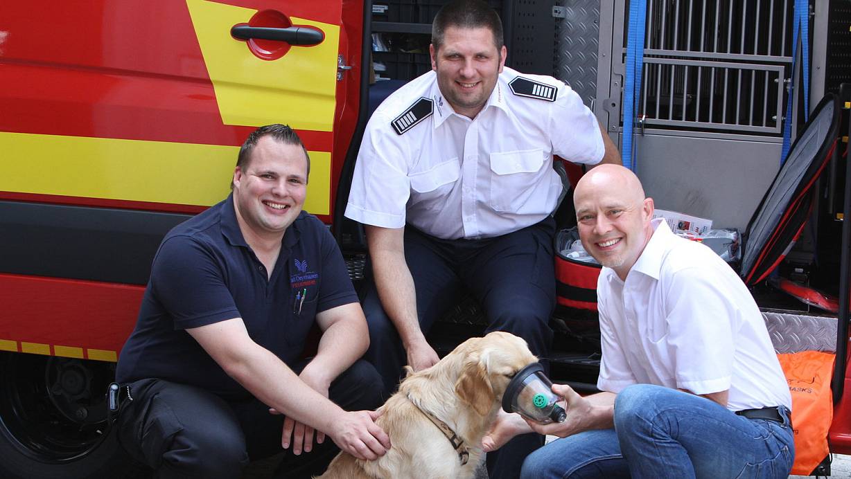 Macht mit: Hündin Luna steckt den Kopf in die Atemmaske, Jan Hoberg (v. l., Feuerwehrmann, Tierpfleger und Fachkraft Tierrettung), Falk Ueckermann und Matthias Schlattmeier freut’s. Fotos: Nicole Sielermann | © Nicole Sielermann