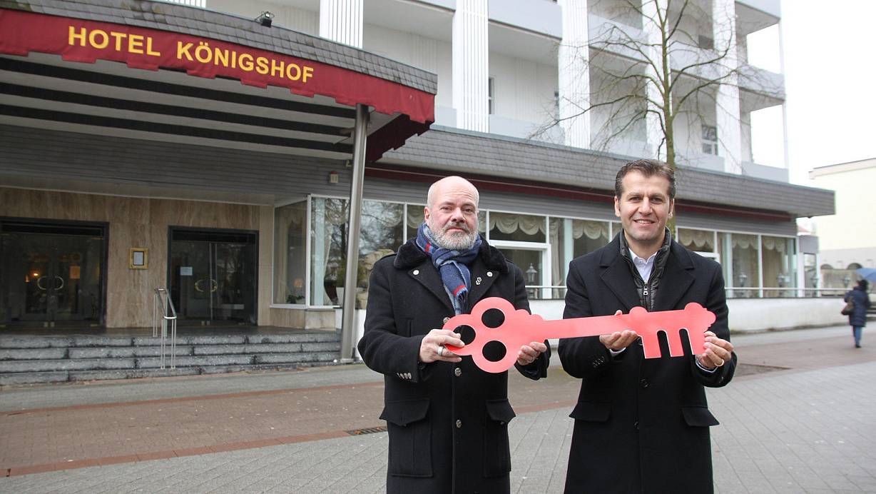 Eigentümerwechsel: Friedrich Molzahn (l.) übergibt den Schlüssel für den Königshof an Manuel Ersay. Foto: Heidi Froreich | © Heidi Froreich