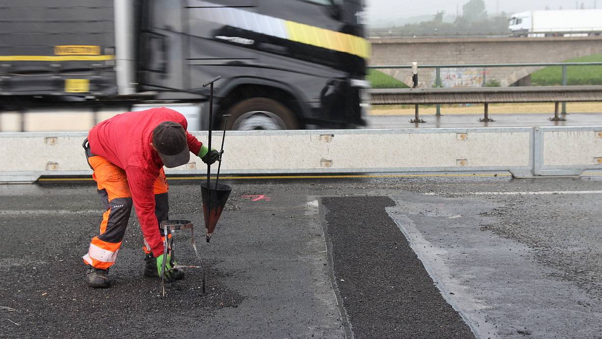 Arbeiter haben am Dienstag Gussasphalt in die Fugen der Weserflutbrücke auf der A2 im Autobahnkreuz Bad Oeynhausen gegossen. | © Ulf Hanke