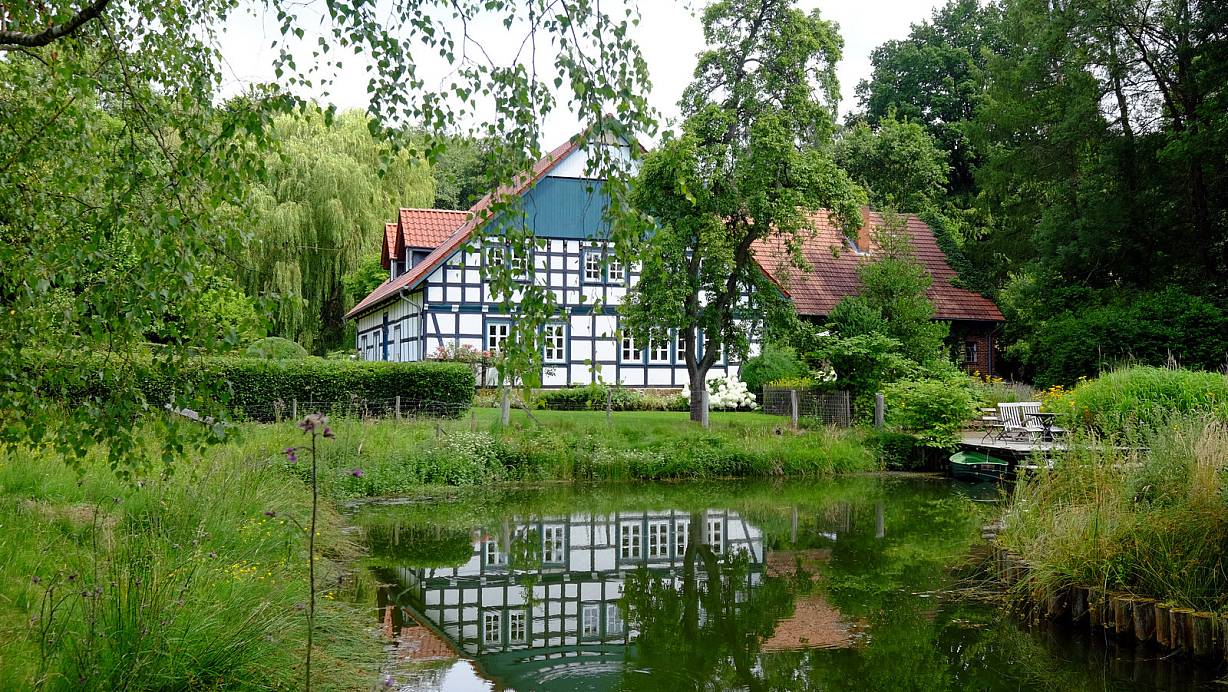 Idylle: Im Teich schwimmen Karpfen. Libellen sausen über die Wasserfläche und das Vierständerhaus fügt sich harmonisch ins Gelände ein Elf Morgen Land, also 27.000 Quadratmeter, gehören zum Haus. Wiesen, Wald und Sumpf machen den Großteil aus. | © Thorsten Gödecker