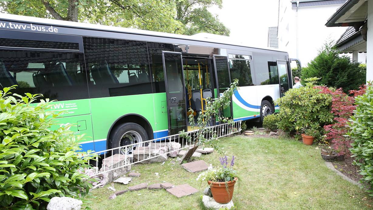 Erheblicher Sachschaden: Der Omnibus hat die Mauer der Familie Schwarz zerstört und steht in einer Buchenhecke. | © Elke Niedringhaus-Haasper