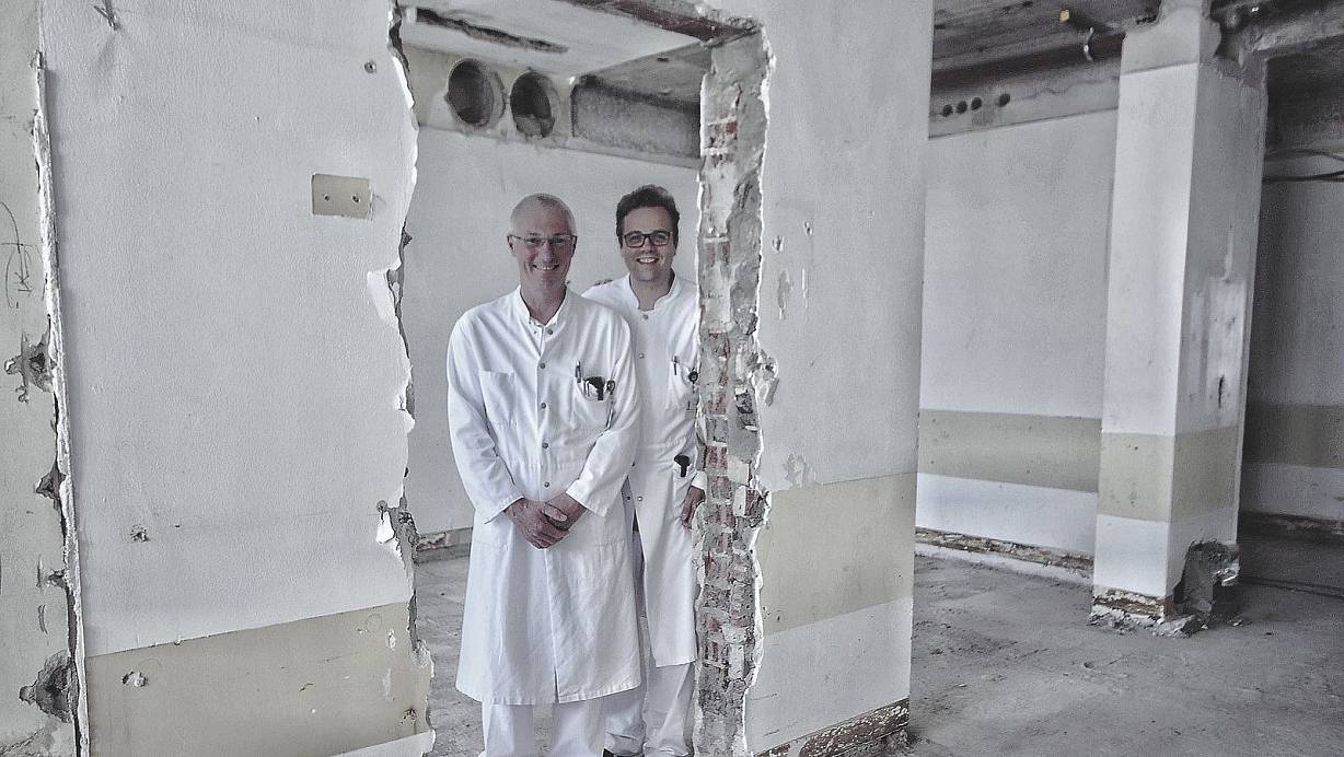 Patientenzimmer: Die Oberärzte Stephan Boensmann (l.) und Michael Hauber in einem entkernten Patientenzimmer. | © Heidi Froreich