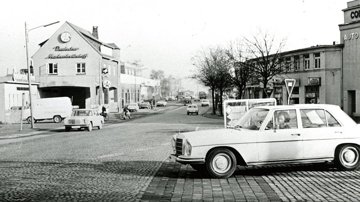 Vorher: Zweispurig mit Kopfsteinpflaster, so präsentierte sich die Mindener Straße vor dem Ausbau. Unser Foto zeigt die Einmündung der Herforder Straße, rechts das Autohaus Fuhrken. Foto: Stadtarchiv | © Stadtarchiv