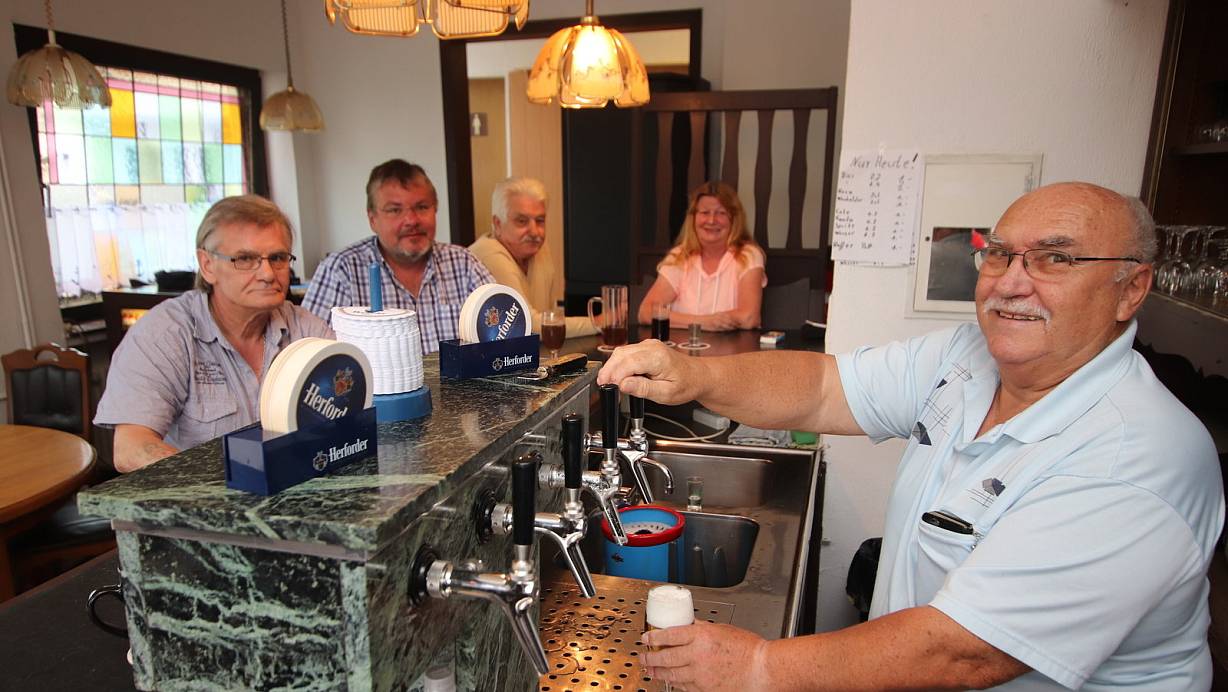 Die Bürgerschützen in ihrer neuen Vereinsgaststätte: Vorsitzender Udo Kaschner (l.) zapft seinen Gästen Adolf Krietemeier (v. l.), Carsten Hagemeier, Manfred Düker und Gabriele Schlangen ein frisches Pils. | © Jörg Stuke