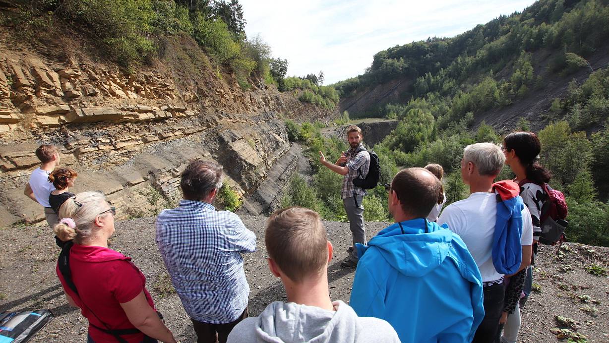 Zum Tag des Geotops zeigte Geowissenschaftler Thomas Lis den ehemaligen Steinbruch Störmer in der Wallücke. Die Exkursion führte durch über 50 Millionen Jahre Erdgeschichte und am Ende zu den Resten von Haien, Krokodilen und Dinos.