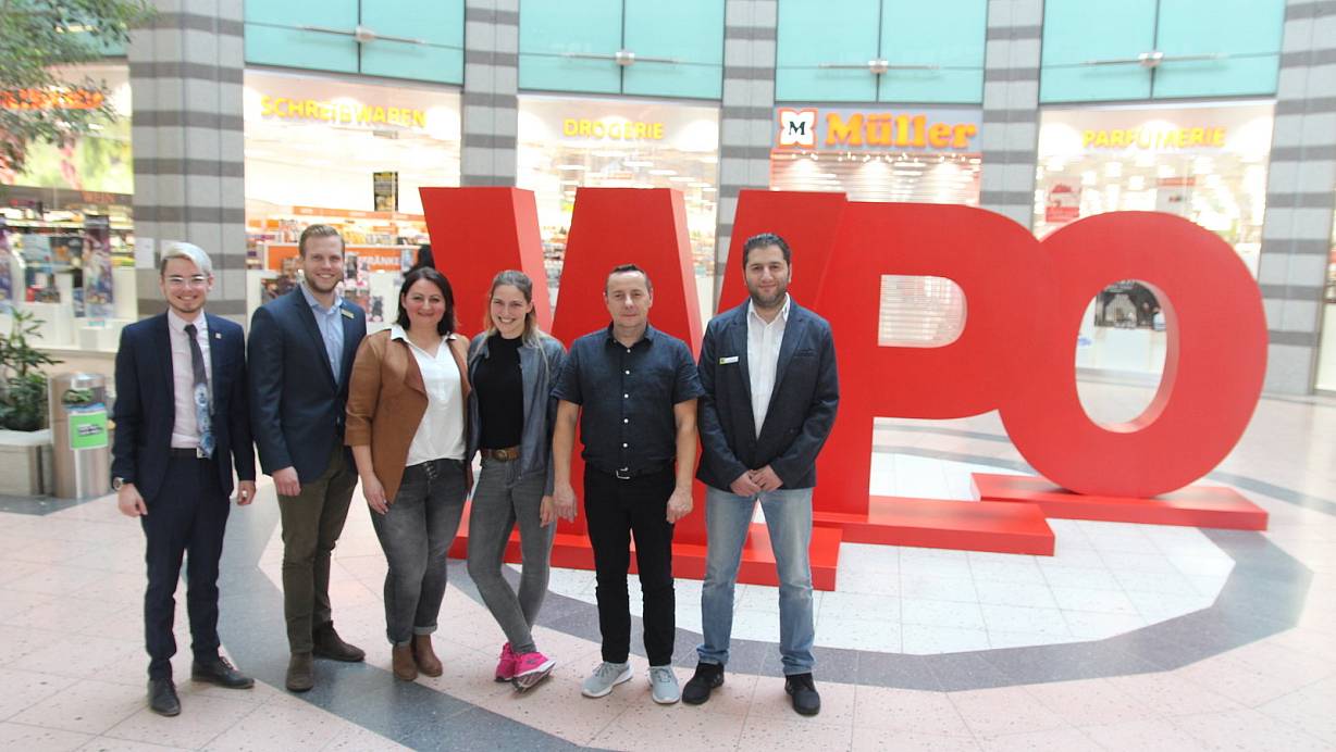 Tobias Gawronski (Müller), v.l.), Center-Manager Torben Schultz, Ewgena August-Ott (Jeans Fritz), Jasmin Hartmann (Decathlon), Ralf Grove (TK Maxx) und Erkan Mercan (Edeka-Markt hoffen auf viele Kunden- nicht nur am Donnerstag. | © Heidi Froreich