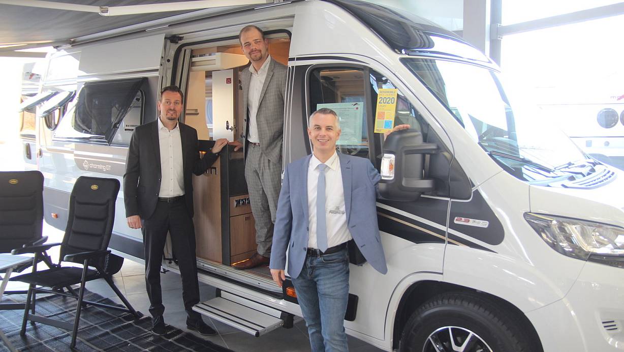 Betriebsleiter Christian Peter (v.l.), Verkäufer Sebastian Wall und Geschäftsführer Marcel Peitzmeyer freuen sich, dass sie jetzt auch Wohnmobile präsentieren können. Die Wagen stehen im Glasturm des Autohauses und können daher bei jedem Wetter besichtigt werden. | © Heidi Froreich