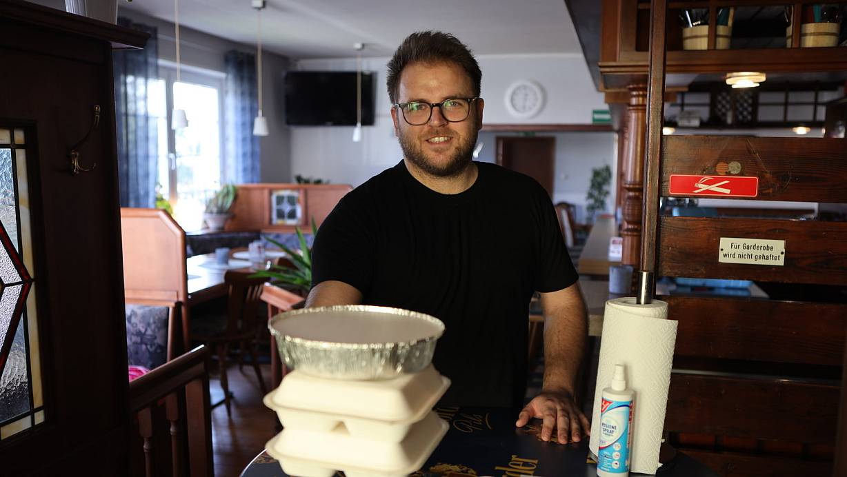Essensausgabe: Gary Rainforth, der Wirt im Werster Hof, hat den Engang zur Gaststube in eine Übergabe-Station verwandelt. Es gibt sogar Desinfektionsmittel auf dem Tisch. | © Jörg Stuke